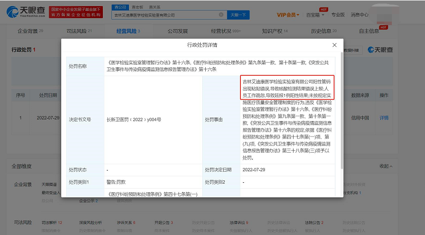 吉林艾迪康核酸检测结果错误上报被罚5万