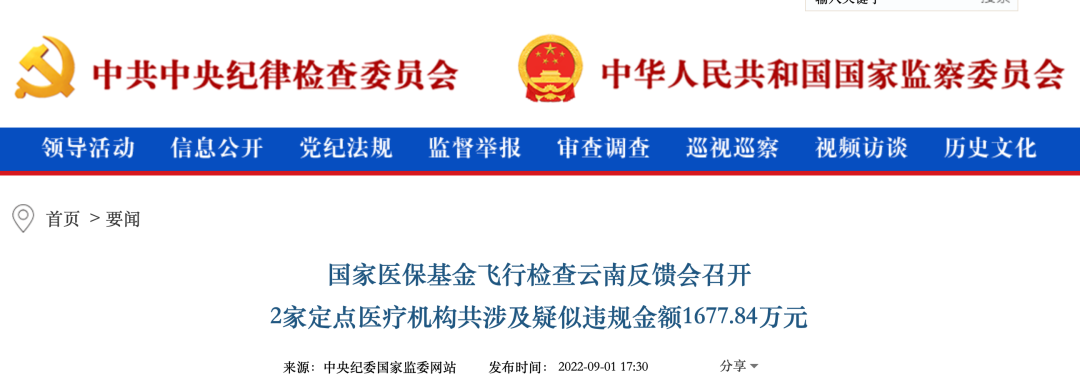 9月1日,中央纪委国家监委网站发布文章《国家医保基金飞行检查云南反馈会召开2家定点医疗机构共涉及疑似违规金额1677.84万元》,公布了国家医保飞检组在云南飞检的最新情况。文章称,8月31日,2022年国家医疗保障基金飞行检查云南反馈会在昆明召开。飞行检查组组长孙晓灿介绍,此次飞行检查共历时13天(含信息人员先期抵达3天),主要通过数据筛查、调阅病历、查阅文件等方式进行,发现问题如下:昆明医科大学第二附属医院共涉及医保管理、医疗及财务等三大类41项问题,涉及疑似违规金额983.15万元;昆明市第一人民医院甘美国际医院共涉及医保管理、医疗及财务等三大类46项问题,涉及疑似违规金额694.69万元。检查发现,上述2家定点医疗机构均涉及超医保限定支付范围、重复收费、超标准收费、分解住院、过度检查诊疗等问题。此外,昆明医科大学第二附属医院还涉及1项高靠诊断问题,昆明市第一人民医院甘美国际医院还涉及2项分解收费问题。同时,飞行检查组结合当地工作实际对昆明市医疗保险管理局进行了现场检查,发现11项具体问题,包括经办管理规程不够完善,内控制度建设和“两定”考核办法不健全,信息平台管理存在漏洞,医保医师管理不规范,账户支取审核不规范,医保结算数据有缺失,审核结算程序有待提高等。反馈会现场,飞行检查组向云南省医保局当面移交检查资料,要求针对移交问题严格依法依规、依照程序逐条对应落实处理,并将整改落实情况报告于30个工作日内反馈至国家医保局。孙晓灿介绍说,8月30日,云南省医保局印发紧急通知,要求全省定点医药机构针对飞行检查发现的问题和违法违规使用医保基金问题开展自查自纠;昆明医科大学第二附属医院在飞检组初步反馈问题后连续召开3个专题会议研究部署整改事宜,并对相关责任人进行了约谈。反馈会召开当天,云南省医保局正式启动2022年度省内医保飞行检查工作。云南省医保局党组书记、局长王艳君表示,将切实担负起整改主体责任,深入剖析问题成因,迅速制定整改方案,细化整改目标、整改单位和完成时限,分类建立整改台账,实行“对账销号”管理,举一反三补齐短板。同时,严格按照飞检后续处理流程,依法依规、实事求是对2家医院违规使用医保基金问题进行核实、查处,对涉嫌欺诈骗保的,依法严肃处理。国家医保局基金监管司有关人员表示,医保部门要责令被检机构及时退回违法违规资金并依法依规进行处罚,对相关人员进行处理,涉及党员、公职人员的按照相关规定移送纪检监察机关;督促被检机构立即开展全面自查自纠,查找院内管理制度漏洞,补齐医保基金使用管理短板,并在全省范围开展类似问题排查整治。