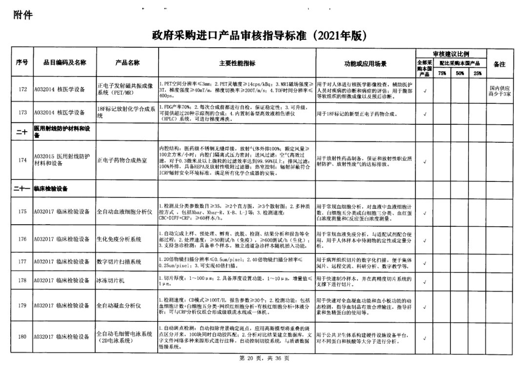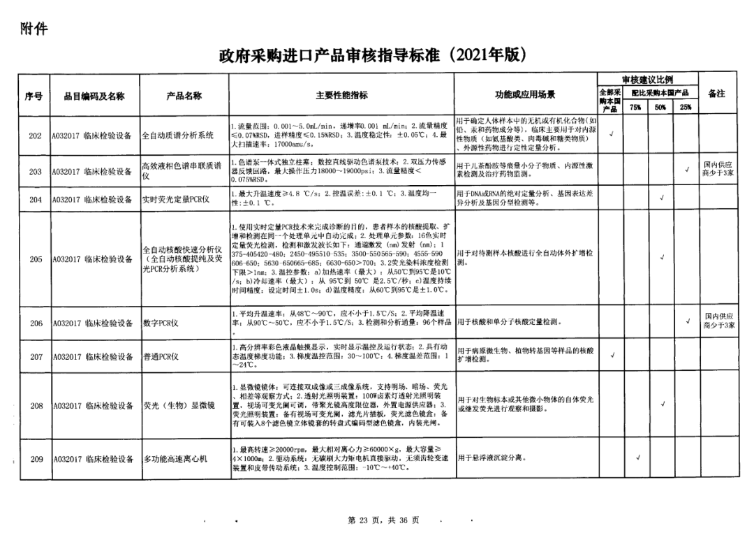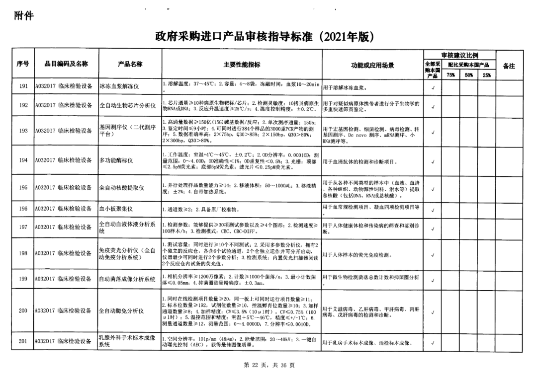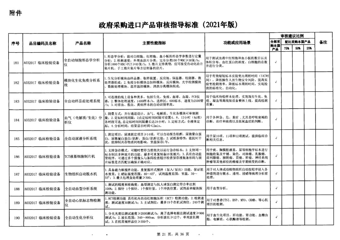 早在2021年,国家财政部及工信部联合发布的《政府采购进口产品审核指导标准》(2021年版)的通知这份通知明确规定了政府机构(事业单位)采购国产医疗器械及仪器的比例要求。涉及大部分常规检验设备,要求全部用国产。