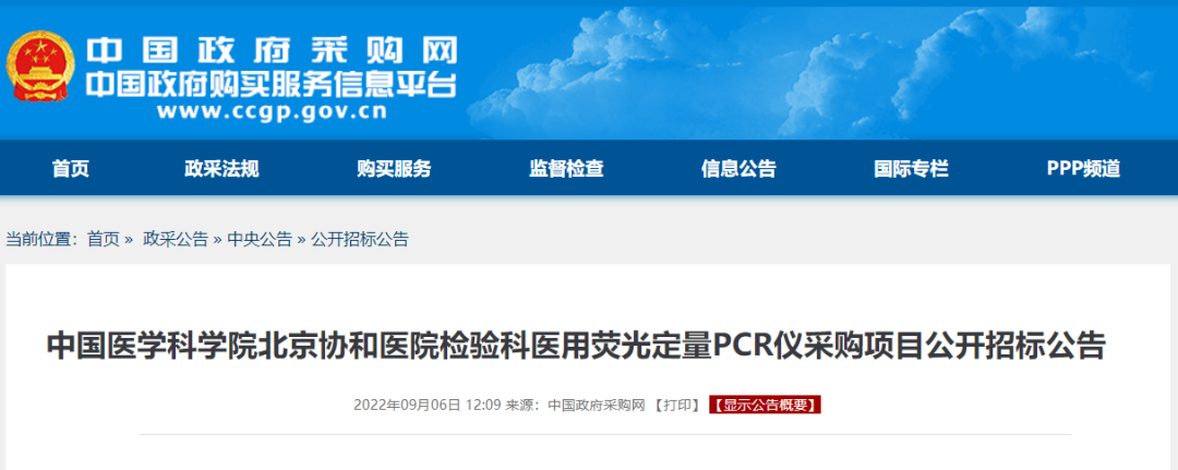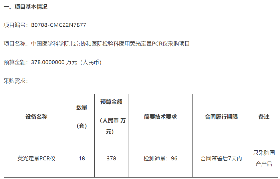 顶级大三甲,北京协和医院检验科,大批量PCR设备招标,指定只要国产产品...9月6日,中国政府采购网发布中国医学科学院北京协和医院检验科医用荧光定量PCR仪采购项目,明确只要国产。 北京协和医院作为国内最顶端三甲,实时荧光PCR仪优秀国产品牌能得到了认可,大范围国产替代也是指日可待的事情。
