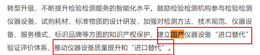 此前,国家市场监督管理总局发布文件,《关于进一步深化改革促进检验检测行业做优做强的指导意见》(以下简称“意见”)。本次“意见”中,为促进检验检测行业做优做强,国家市场监督管理局明确提出,要建立国产仪器设备“进口替代”验证评价体系,推动仪器设备质量提升和“进口替代”。不仅如此,“意见”明确,要着力扶持、培育一批技术能力强、服务信誉好的检验检测机构成为行业品牌,提高品牌的知名度、美誉度和公信力,推动形成检验检测国际知名品牌。国产仪器设备“进口替代”,从来都不是说说而已。纵观这些年来国产仪器设备的进阶之路上,国家总是一次又一次不遗余力的扶持。