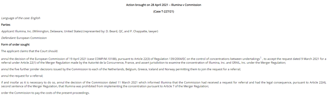 这是不久前刚赢了FTC一局之后春风得意的Illumina意料之中的一次打击(见这里),特别是关注咱们号的股东,自然知道这在我们的推演之中。 那么,我们稍微深入一点,谈点其他相关的内容。 欧洲普通法院 在新闻稿里有这么一段: Illumina is separately appealing a July 2022 decision by the General Court of the European Union regarding the European Commission's jurisdiction to challenge the GRAIL deal. 那么这个上诉诉的是啥? (欧洲普通法院) 早在2021年4月28日,Illumina就向欧洲普通法院(不知道翻译的是否准确哈)提起了诉讼,主要要求: 1:判令撤销欧盟委员会的关于禁止Illumina实施集中(收购GRAIL)的决定; 2:诉讼费用由欧盟委员会承担。 其主要的依据是其并未触犯欧盟的经营者集中申报制度,因此欧盟委员会的禁令应该是无效的2,案件编号T-227/21。 2022年7月13日,欧盟普通法院做出裁决,认为虽然Illumina收购GRAIL即便没有触发经营集中申报制度,欧盟委员会仍然有管辖权2。 原文太长,有篇解读虽然也很长看标题就差不多理解了3 有兴趣的可以去读下原文,反正就是自己人帮自己人了。 这就给欧盟委员会在9月6日做出限制令扫清了障碍。当然对于这个裁决Illumina肯定表示了上诉。 欧盟委员会的视角 欧盟委员会的新闻稿4表述与Illumina有些不同,有兴趣的看原文,没兴趣的我总结下重点: