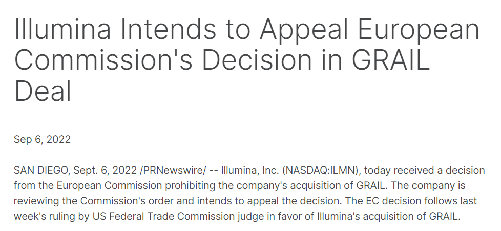 朋友们、股东们,本来今天准备继续更新合成生物学公司来着,结果翻了翻这个新闻发现绝大多数都是复读机,比较失望,于是决定自己翻翻看细节再跟大家汇报下。这期基本没图,比较干,凑合着看吧。 另外有股东说之前没放资料来源,这次。。。基本放了。P2继续是中秋节海报,无LOGO自取哈。感谢各位股东的点赞、转发、在看和打赏。 ALJ往左EC往右 2022年9月6日,Illumina在官方网站发表名为《Illumina拟就欧盟委员会(European Commission,EC)关于收购GRAIL的交易的决定进行上诉》的新闻稿1。 我们大概看下这个新闻稿主要内容是以下几点(大部分国内号都几乎一字不漏的翻译了):