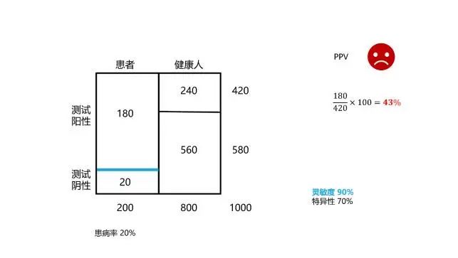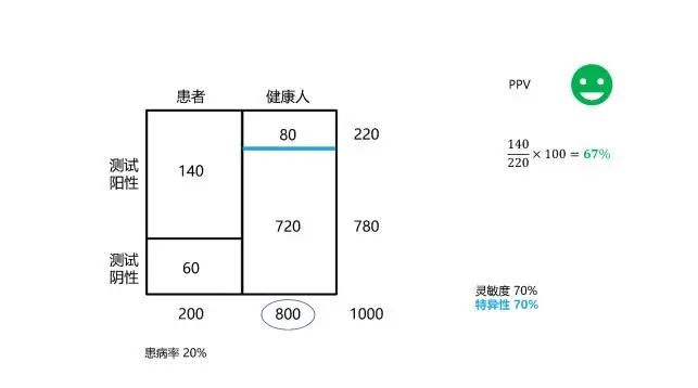 除了患病率外,还有一个变量对阳性预测值(PPV)有很大影响。这个变量被称为特异性。 这里有一个例子。让我们来看看一个有1000人的人口。假设患病率为20%,因此200人有这种疾病,800人没有。测试的灵敏度是70%,特异性也是70%。因此,在200个病人中,70%,即140人,将被测试发现,而60人将被遗漏。 同样地,70%,即560个未患病的人将被发现,而240人将被错误地归类为患病。总的来说,我们有380人检测结果呈阳性--140个真阳性,240个假阳性。 图1 | 在1000人的人口中,一种流行率为20%的疾病将影响200人。一个具有70%灵敏度和70%特异性的测试将正确识别140个患病的人和560个没有患病的人。这将留下60个假阴性和240个假阳性的结果。 现在我们来计算一下PPV。140个真阳性结果除以380个测试阳性者,乘以100,等于37%,这结果相当糟糕。 图2 | 对于20%的疾病流行率,在这个人群中使用灵敏度和特异性均为70%的测试,可产生37%的阳性预测值,或PPV。 如果我们使用一个灵敏度更高的测试,会发生什么? 现在让我们看看,如果我们把灵敏度改为90%,阳性预测值会发生什么变化。现在,在200个病人中,我们将挑选出180人,我们将错过20人。没有患病的人没有变化,因为特异性保持在70%。所以总的来说,我们最终会有420人检测出阳性。 PPV的计算方法是180除以420,乘以100,等于43%。因此,与我们最初的37%相比,没有大的改进。 图3 | 对于20%的疾病流行率,在这个人群中使用灵敏度为90%、特异性为70%的测试,产生的阳性预测值(PPV)为43%。 如果我们使用一个特异性更高的测试,会发生什么? 现在,让我们看看如果我们采用最初的数字,并将特异性从70%改为90%会发生什么。在这种情况下,患病的人数和他们的结果保持不变,因为灵敏度保持在70%不变。现在我们正确诊断了90%的非患者,即720人,我们将得到80个假阳性。 所以总的来说,有220人检测为阳性。阳性预测值是140除以220,乘以100,等于64%。这比我们最初的37%要好得多! 图4 | 对于20%的疾病流行率,在这个人群中使用灵敏度为70%、特异性为90%的测试,产生的阳性预测值为67%。 为什么特异性对阳性预测值的影响比灵敏度大得多? 嗯,因为在正常人群中,健康人组有更多的人。因此,正确识别为阴性的健康人个体数量的1%变化,即特异性,比正确检测为阳性的疾病个体数量的1%变化(即灵敏度)的影响要大得多。 |