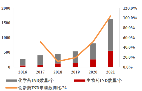 2015年后,随着加入国际ICH、MAH、优先审评等一系列国内新药审评政策的逐步落地和资本的推动,国产创新药研发进入快车道。国产创新药临床申请数逐年增高,2021国产创新药IND数量同比增长104%。