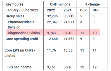2022年上半年,罗氏集团销售额323亿瑞士法郎(约合人民币2322亿元)。制药业务营收223.47亿瑞士法郎(+3%),占比69%;诊断业务营收99.48 亿瑞士法郎(约合715亿元人民币)(+10%),占比31%。