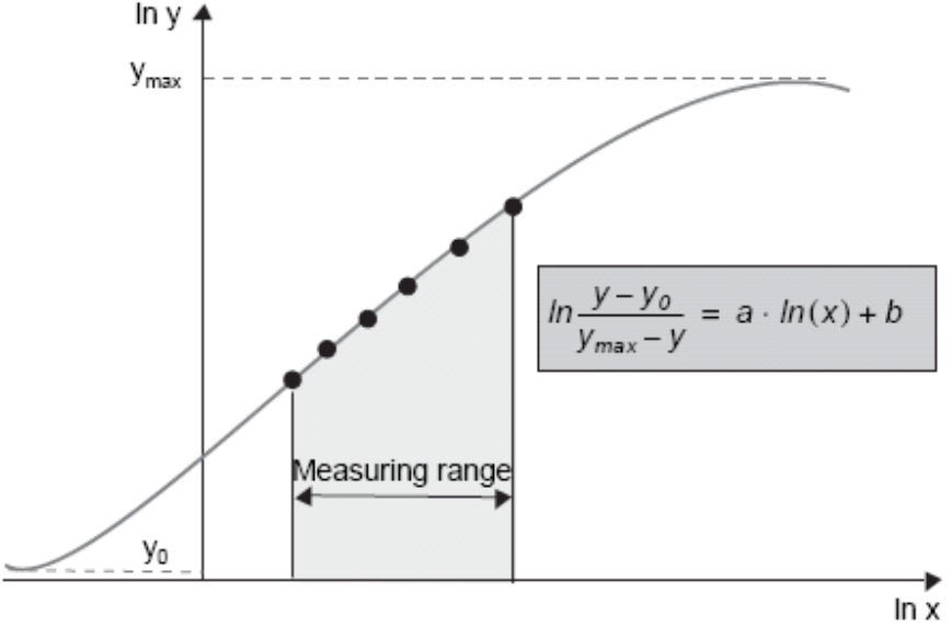 Logit-log曲线 对散射比浊结果的数学处理,很多应用了Logit-Log曲线。将标准品浓度(x)与对应散射光强度(y)各自取自然对数(In),绘制在In x和In y图上。由图上可看到随着分析物浓度的上升,检测散射光强度的变化。如图7-24。该图也称为Logit-Log函数。 图15、Logit-Log函数图 该图表示了检测散射光强度y,与各个校准品浓度C的关系。因为采用了互相取对数表示,反映了免疫反应连续的信号级数变化。 如果logit-log曲线很好,可进行以下计算: 式中:y为检测信号bit值;C为浓度值;y0为最小计算信号;ymax为最大计算信号;a为斜率;b为截距。 y0、ymax、a和b均由电脑计算出来的参数。参考曲线的趋向可由这四个参数描述。