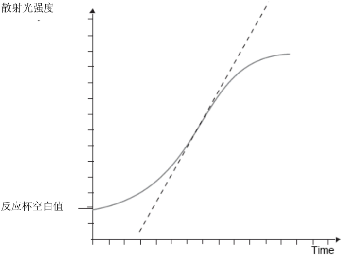 第一个检测模式为终点检测。仅用于某些选定项目,例如以TCA(三氯乙酸)沉淀法检测血清、血浆、尿液和脑脊液内的总蛋白。 该方法学检测抗原抗体反应的最大浊度。然后将检测信号值与校正曲线比较转换为蛋白浓度。 图12、散射免疫散射比浊的终点检测模式 第二个检测模式为定时速率。这个模式,是在两个时间点检测信号间差异,去确定样品内蛋白浓度。 将反应组分转入比色杯后,第一次检测(起始)在约7.5s(t1)。 第二次检测的t2,可在孵育反应6分钟、12分钟或更长时间(依据设定程序)。 计算t2和t1检测得到的散射光强度差,从校准曲线上得到蛋白浓度或其他单位值(g/L、IU/ml)。 图13、定时速率检测 这个方法的优点,是在开始时还没有形成抗原抗体复合物时,通过信号差,扣除了反应组分内因基质散射的干扰。 第三个为全程持续监视(VLinIntegral)检测模式。 VlinIntegral是一个新的数学计算处理,用来评估动力学的凝集反应,例如颗粒增强的免疫分析法或沉淀实验。 这个计算的优点是: