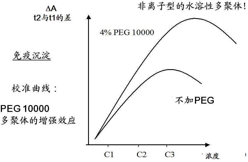 五、解决抗原过剩的化学方法 其实任何一个检测方法学,都是在不断迎接临床要求中,面对问题进行研究和采取措施下,才得以向前发展的。 检测样品中蛋白质,使用对应抗体;形成抗原抗体复合物;为了是散射比浊甚至包括透射比浊能够顺利完成,引入了聚苯乙烯胶乳为抗体的载体!使抗原抗体复合物的颗粒放大,满足检测方法的要求;但还是需要克服抗原过剩的问题!因为,检测样品来自各个病人,样品中内含的某个蛋白质含量在样品间差异很大。仅仅依靠调整试剂中抗体的用量,还是无法满足检测要求。关键时刻,在免疫检测中,出现使用非离子型的水溶性多聚体!将聚乙二醇加到试剂中,可以极大地增强了抗原抗体形成的效应!这就使原有的抗原抗体沉淀反应“Heidelberger-Kendall曲线”曲线向右延伸,扩大了抗体过剩的范围。反之,扩大了实际的样品中蛋白质的检测范围!参见图17。 图17、PEG 10000多聚体的增强效应 因此,这些方法学的发展,更加促进了使用特定抗体对蛋白质抗原进行检测的沉淀反应的发展!目前,各个试剂厂商,凡是使用抗原抗体复合物沉淀反应的试剂,在它们的试剂配方中,几乎都加入了聚乙二醇等。