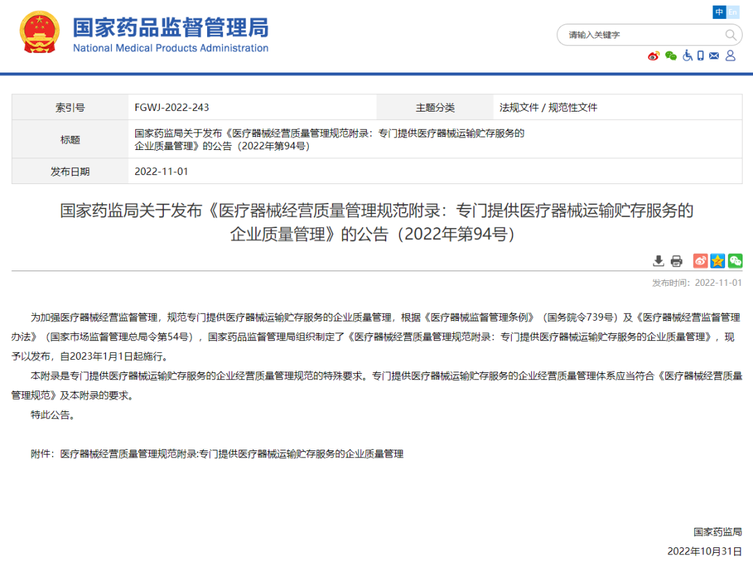 近日,国家药监局发布了《医疗器械经营质量管理规范附录:专门提供医疗器械运输贮存服务的企业质量管理》(以下简称《附录》),规范专门提供医疗器械运输、贮存服务(即俗称“第三方物流”)的企业质量管理,保证医疗器械在运输、贮存环节的质量安全,促进医疗器械物流行业高质量发展。《附录》自2023年1月1日起施行。 《附录》是专门提供医疗器械运输贮存服务的企业经营质量管理规范的特殊要求。该类企业经营质量管理体系应当符合《医疗器械经营质量管理规范》及《附录》的要求。此次管理规范涉及企业众多,施行后将更好的保障医疗器械在运输贮存过程中的质量安全。据医械数据云统计,目前我国已注册第三方医疗器械运输企业共804家,其中广东省162家,占比20.1%,为注册企业最多的的省份,其次是江苏省,共102家,占比12.7%。 《附录》从质量管理体系建立与改进、机构与人员、设施与设备、计算机信息系统以及质量责任等方面,对专门提供医疗器械运输、贮存服务的企业提出具体要求。 制定的背景及意义 医疗器械的质量安全关乎人民群众生命健康,医疗器械经营过程中的运输、贮存环节直接影响产品的质量安全。党中央、国务院高度重视医疗器械质量安全与医药行业健康发展,国家药监局组织制定了《医疗器械经营质量管理规范附录:专门提供医疗器械运输贮存服务的企业质量管理》保证医疗器械在运输、贮存环节的质量安全。 明确人员、设施配备 《附录》明确了专门提供医疗器械运输、贮存服务的企业人员岗位配置与素质要求,明确相关岗位人员工作经历、年限、专业等要求。 专门提供医疗器械运输、贮存服务的企业应当配备与所提供运输、贮存服务规模相适应的设备设施,仓储设备设施应当包括:计算机硬件设备,医疗器械唯一标识采集识读设备,货架系统,装卸搬运及输送设备,分拣及出库设备,避光、通风、防潮、防虫、防鼠等设备,温湿度自动监测及控制设备,运输车辆及设备。 专门提供医疗器械运输、贮存服务的企业应当加强实时监测监控管理,对作业流程及及异常状况监控;运输、贮存产品包括冷链管理医疗器械时,还应当配备备用供电设备或采用双路供电,保证在紧急情况下能够及时采取有效应对措施。 同时,鼓励专门提供医疗器械运输、贮存服务的企业采用创新技术,建设医疗器械自动化仓库,如高层货架、自动分拣机、出入库自动输送系统以及周边设施设备等构成的现代化自动仓,减少人工差错,提升服务能力。 计算机信息系统作用 计算机信息系统是专门提供医疗器械运输、贮存服务的企业的质量管理体系的核心组成部分,应当具备权限、数据、记录、报表等多方面功能,可以有效固化质量体系的流程和质控点,可以全面的留存操作过程的记录,可以承载不同岗位、不同企业主体的互联互通。专门提供医疗器械运输、贮存服务企业的计算机信息系统应当包括仓库管理系统、温湿度监测系统、运输管理系统等。需冷链运输医疗器械的还应当配备冷链运输管理系统。计算机信息系统应当对医疗器械的运输、贮存全过程实行动态管理和控制,对相关数据进行收集、记录、查询、统计。 明确委托双方的质量责任 《附录》明确了委托方和受托专门提供医疗器械运输、贮存服务的企业双方的责任要求。委托方是医疗器械经营的质量责任主体。委托方应当负责其经营医疗器械的供货者、购货者与医疗器械产品资质审核、采购、销售、售后服务及医疗器械召回、不良事件监测等工作,并对委托的专门提供医疗器械运输、贮存服务的企业进行必要的质量监督。专门提供医疗器械运输、贮存服务的企业负责收货、验收、贮存、在库检查、出库复核、发货与运输的具体操作,以及协助委托方进行退货、召回、不良事件监测等工作。 |