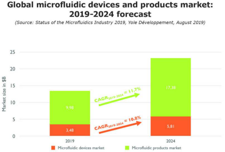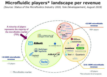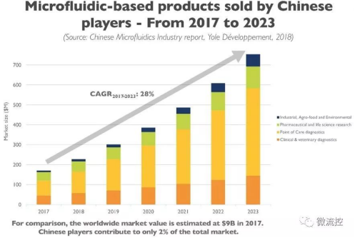 微流控技术年表(含国内IVD微流控政策) 根据Yole分析师最新数据统计显示,2018年全球微流控产品市场规模达到87亿美元,2019-2024年期间的复合年增长率高达11.7%,预计2024年将达到174亿美元。两项主要应用为:(1)即时检测(POCT);(2)制药/生命科学研究(包括测序、基因组学和蛋白质组学)。不过,其它微流控应用也在不断发展。Cephied 公司的 GeneXpert( 2020 年收入约为 20 亿美元,全球装机量超过20000 台)、原Biofire公司的 Film Array( 2018 年销售额为 4.83 亿欧元,2020 年销售额超过 10 亿欧元,全球装机量从 2018 年底的 8200 台达到 2022 年的 22000 台)