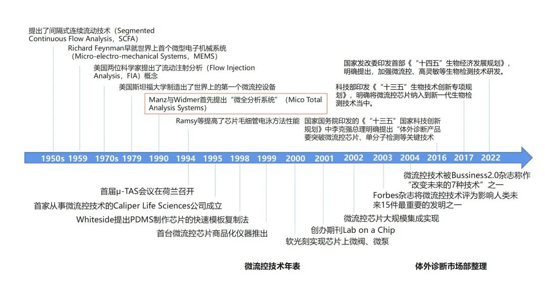 | 微流控(Microfluidics),是一种精确控制和操控微尺度流体,尤其特指亚微米结构的技术,又称其为芯片实验室(Lab-on-a-Chip)或微流控芯片技术。微流控分析芯片最初在美国被称为“芯片实验室”(lab-on-a-chip),在欧洲被称为“微整合分析芯片”(micrototal analytical systems),它是微流控技术(Microfluidics)实现的主要平台,可以把生物、化学、医学分析过程的样品制备、反应、分离、检测等基本操作单元集成到一块微米尺度的芯片上,自动完成分析全过程。有着体积轻巧、使用样品及试剂量少,且反应速度快、可大量平行处理及可即用即弃等优点的微流控芯片,在生物、化学、医学等领域有着的巨大潜力,近年来已经发展成为一个生物、化学、医学、流体、电子、材料、机械等学科交叉的崭新研究领域。20世纪50年代,提出了间隔式连续流动技术(Segmented Continuous Flow Analysis,SCFA上世纪50年代末,美国诺贝尔物理学奖得主Richard Feynman教授在1959年使用半导体材料将实验用的机械系统微型化,从而造就了世界上首个微型电子机械系统(Micro-electro-mechanical Systems,MEMS)20世纪70年代,美国两位科学家开拓性提出了流动注射分析(Flow Injection Analysis,FIA)的概念1979年,美国斯坦福大学将理论变为了现实,制造出了世界上的第一个微流控设备1990年,由瑞士Ciba-Geigy公司的Manz与Widmer应用MEMS技术,首先提出的“微全分析系统”(Mico Total Analysis Systems),即μTAS(ì-TAS)1994年,Ramsy等在Manz的研究基础上,改进了芯片毛细管电泳进样方法,提高了其性能,同年,首届μ-TAS会议在荷兰召开。1995年,首家从事微流控技术的Caliper Life Sciences公司成立1998年,Whiteside提出PDMS制作芯片的快速模板复制法1999年,首台微流控芯片商品化仪器推出,HP(Agilent)和Caliper公司联合推出,最早应用于生物分析和临床分析领域。2001年,创办期刊Lab on a Chip,专门用于收录微流控技术研究类文章。2003年,Forbes杂志将微流控技术评为影响人类未来15件最重要的发明之一2004年,微流控技术被Bussiness2.0杂志称作“改变未来的7种技术”之一2016年7月,国家国务院印发的《“十三五”国家科技创新规划》中李克强总理明确提出“体外诊断产品要突破微流控芯片、单分子检测等关键技术2017 年,科技部印发《“十三五”生物技术创新专项规划》,明确将微流控芯片纳入到新一代生物检测技术当中。2022年5月10日,国家发改委印发首部《“十四五”生物经济发展规划》,明确提出,加强微流控、高灵敏等生物检测技术研发。