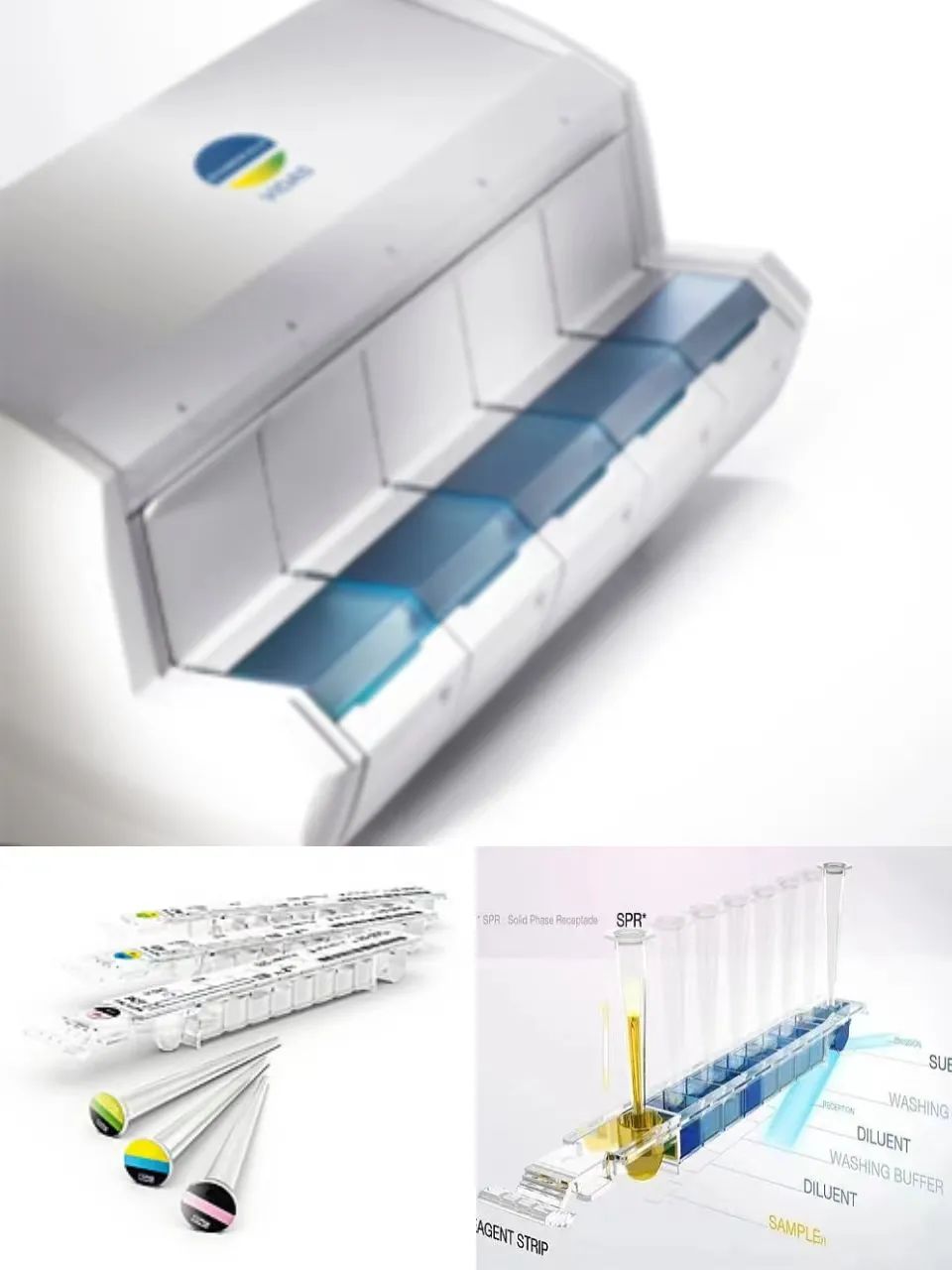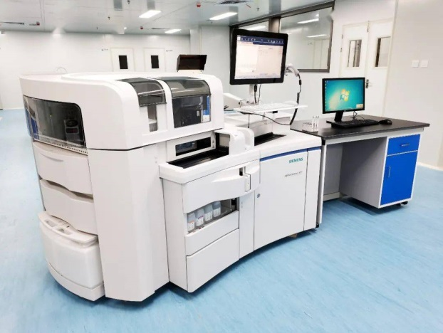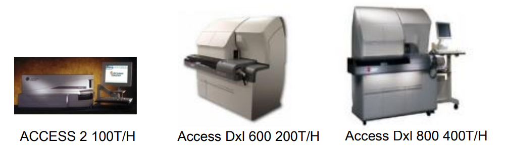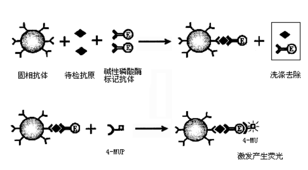 图 荧光酶免疫测定(双抗夹心法)示意图 荧光酶免测定就是利用理想的酶荧光底物,生成的产物稳定并有较强的荧光,通过荧光强度测定进行定量;化学发光酶免测定就是利用酶对发光底物的催化作用而直接发光,通过光强度的测定而直接进行定量。 图 贝克曼ACCESS系列 图 安图A2000