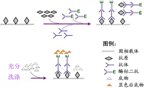 酶免疫测定技术(enzyme immunoassay technique,EIT)是以酶标记的抗原或抗体作为主要试剂的免疫测定方法。在抗原抗体的特异性反应后,通过标记酶对底物的酶解呈色,根据呈色的深浅可以对相应抗体或抗原进行定性或定量测定。根据抗原抗体反应后是否需要分离结合的与游离的酶标记物,可分为均相和非均相两类。