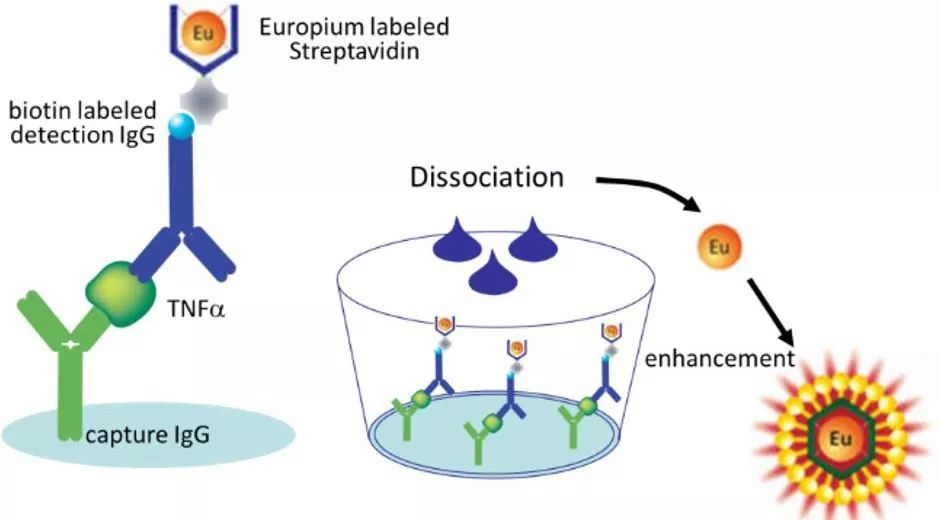 时间分辨荧光 (TRF) 通过使用铕或铽等能够发射长半衰期荧光信号的镧系元素作为荧光基团来降低背景信号值干扰。这种长半衰期荧光信号可持续数毫秒,因此可以使用脉冲光源(如氙闪灯)激发荧光基团,隔一段时间再进行发射信号检测(“计数窗”)。短半衰期荧光(仅持续数纳秒)在信号检测之前就会消失。使用时间分辨荧光进行测定可大大降低信噪比。 另一特点是,激发光和荧光的波长位移大、荧光光谱峰窄,可有效消除激发光的干扰。 凡是用RIA或ELISA测定的物质均可以用本法测定。