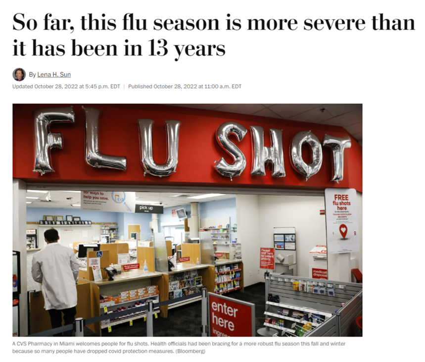 据华盛顿邮报的最近报道,美国今年流感季节来得突然,将是最近13年来最严重的1年,而且比往常早了很多,目前已经造成了13年来因流感住院最多的病例人数。