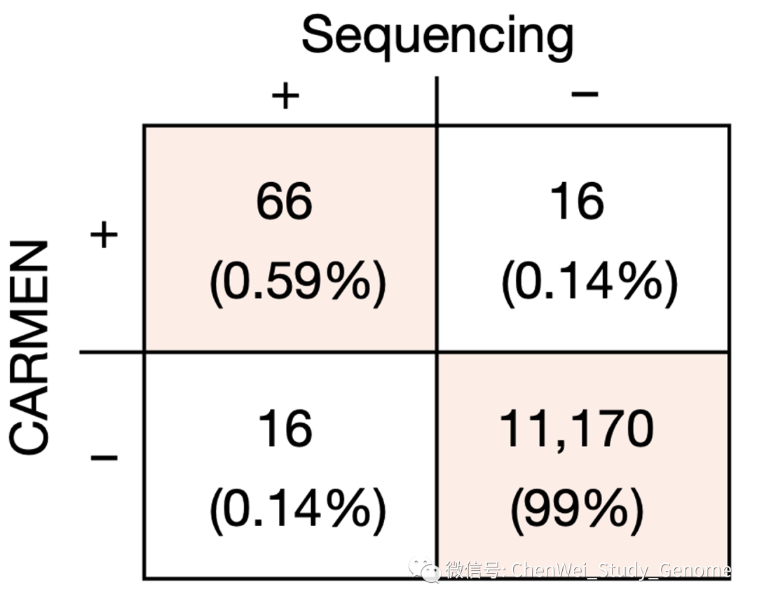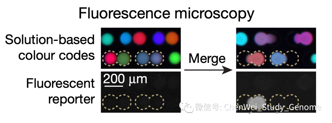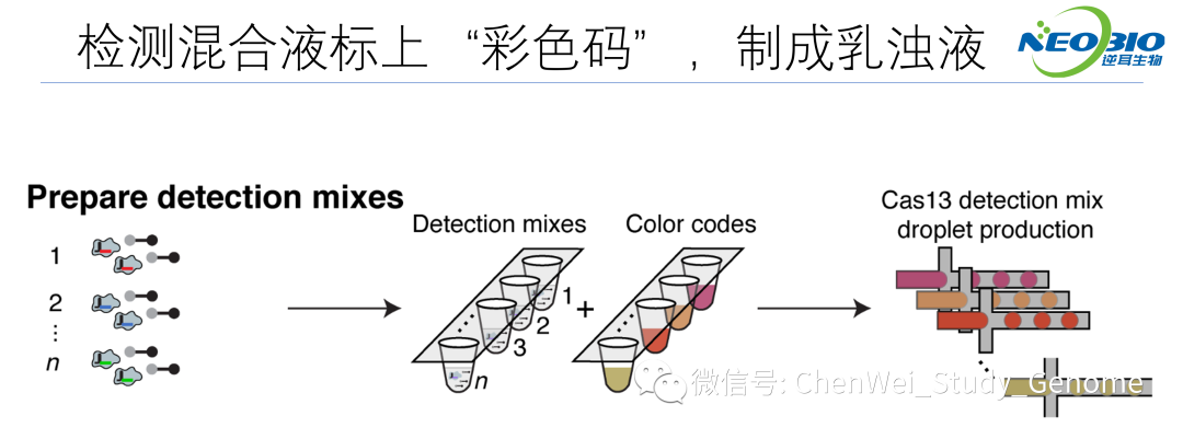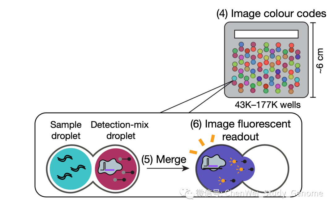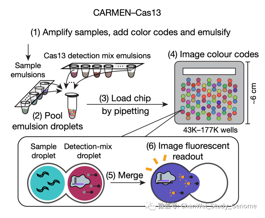 视频内容简介 1、CARMEN 是一种创新的快速、高通量、多病原体广谱检测的方法; 2、CARMEN 方法有较高的特异性和灵敏度; 3、CARMEN方法通过微流控乳浊液化、和彩色码两项技术,结合显微荧光扫描,极大地降低了广谱病原体检测的成本。作者自己的说法是把成本降低了 300 倍。 视频字幕内容 大家好!欢迎来到【陈巍学基因】。今天我给大家讲《高通量广谱检测病原体新技术:CARMEN》 今天,我们要讲的内容,分4个部分:1、文章概要;2、实验原理;3、实验结果;4、分析小结 我们先说第一部分,文章概要 文章的题目,是《Massively multiplexed nucleic acid detection with Cas13》。这篇论文发表在 Nature 杂志的 2020 年的 6 月刊上。 论文题目,翻译成中文,意思是《使用 Cas13 进行大规模多重核酸检测》。 论文中展示了一种新开创的技术:CARMEN 技术。CARMEN 是“Combinatorial Arrayed Reactions for Multiplexed Evaluation of Nucleic acids”的首字母缩写。 第二部分,我们来说实验原理 我们先要说一下 Cas13 这个酶和 SHERLOCK 检测。 先说 Cas13 这个酶。Cas13 酶和 CRISPR 反应中的 Cas9 酶是类似的,可以在 guide RNA 的引导下,识别目标核酸链,并切割目标核酸链。 但 Cas13 这个酶与 Cas9 酶不同的点在于,它切割的目标是 RNA 链,而不是象 Cas9 酶那样是切割目标 DNA 链。 并且,Cas13 还有一个特点,当 Cas13 酶结合到 guide RNA 和目标 RNA 结合的 它不仅可以切割目标 RNA 链,它还会切割附近的 RNA 链。 那么利用这种特性,就可以设计一类似 Taqman 的 RNA 探针。这个 RNA 探针一端连着一个荧光基团,另一端连着一个淬灭基团。 当这个 RNA 链是完整的时候,淬灭基团会熄灭荧光基团,那么这个 RNA 探针就不会发出荧光。 而当 RNA 被切断后,淬灭基团和荧光基团分开,荧光基团就会发出荧光。 那么当这个体系中的 guide RNA 有发生与目标 RNA 结合的时候,Cas13 就会切断这个荧光探针,被切断的探针就会发出荧光。 在了解了 Cas13 酶切割探针,发出荧光的原理之后,我们再来看 SHERLOCK 检测。 SHERLOCK 是“specific high-sensitivity enzymatic reporter unlocking”的首字母缩写。翻成中文,意思是:“特异性高灵敏度酶报告基因解锁”。 大侦探“福尔摩斯”的全名是: Sherlock Holmes。可见这里给这个检测方法起“SHERLOCK”这个缩写名,有借用福尔摩斯的侦探能力的意思。 SHERLOCK 的实验原理,先是把抽提得到核酸做扩增。对其中的 DNA 做 RPA 扩增,RPA 扩增是一个类似 PCR 扩增的反应,但它不需要做热循环,只要温度保持在 37-42°C 之间,就可以进行反应。 对 RNA,则是做 RT-RPA,也就是“逆转录 RPA”,结果会是得到扩增了的 cDNA。接下来,扩增出来的 DNA 和 cDNA,都经过 T7 转录酶的转录,转录出许多的 RNA 链。然后,加入 Cas13 酶、guide RNA 和荧光探针,进行反应。如果被检测的样本中存在与 guide RNA 相对应的目标 RNA,则荧光探针会被 Cas13 酶所切割,并发出荧光。 检测样本是否发出荧光,就可以判断样本中是否存在目标核酸链。进而可以推断样本中是否有特定的病原体。 在了解了 SHERLOCK 检测的方法原理之后,接下来我们来说 CARMEN 的实验设计。这是 CARMEN 实验设计的原理图。 实验中用到“Color code”。“color code”的意思是,几种颜色荧光,比例不同,组成一组排列组合。我把它翻译成“彩色码”。 以“红、绿、蓝”三种荧光组成的彩色码为例,每一种荧光颜色都随着加入的相应的荧光染料的增多,而荧光强度增强。比如,红色可以取 0,1,2,4,……,一直到 64,一共 8 种荧光强度。 同样,绿色和蓝色也可以同样取 8 种荧光强度,那么把三种颜色的荧光组合起来,有 8 的 3 次方种组合,也就是可以得到 512(8*8*8 = 512)种颜色组合。 用这些颜色组合对特定的溶液做标记,就叫“彩色码”。 作者,先把几种样本,分别完成前面的核酸抽提、扩增、和转录的工作。接着,每个样本分别用荧光染料标上彩色码。 注意一下,这里用的荧光染料的颜色是偏蓝绿色的。 然后,把这些用彩色码标记了的 RNA 溶液,分别通过微流控系统,制成油包水的乳浊液。 同样原理,把分别针对若干种病毒 RNA 的探针,做成检测混合液。然后把每种混合液也加入彩色码做好标记。但请注意,标记检测液的彩色码的颜色是偏红橙色的,是和之前标记样本的蓝绿色的色系是分开的。然后,把每种检测混合液分别做成乳浊液。 接下来,把这若干个样本的乳浊液、和若干种检测液的乳浊液混合在一起。 然后,把这个混合液加载到特制的微孔板上。 这个特制的微孔板,需要特别介绍一下。这个板,是用聚二甲硅氧烷(PDMS, polydimethylsiloxane) 制成的。这是一种软的、且透明的胶质的材料。 它的大小约是手机的大小。 板的上面,布满了小孔。我们把这些小孔放大来看,每一个小孔的样子象一个空心的“8”字。一个小孔正好能放下乳浊液中的两个微滴。 一块板子,有 4.24 万个这样的小孔。 在使用的时候,在微孔板上还会加盖一个盖板。盖板和这个微孔板之间可以用螺丝锁紧。盖板的作用是把微滴锁定在小孔中,让不同小孔之间的微滴在锁定之后不会交叉污染。 在把乳浊液加入到这个微孔板之后,乳浊液中的微滴进入微孔。一个微孔中,正好容纳两个微滴。 这时候,先对微孔板进行一次荧光显微扫描成像。 然后,进行电击。电击会使一个小孔中的两个微滴融合。 如果样本微滴中的 RNA,正好能被检测微滴中的 guide RNA 识别,就会激活检测微滴中的 Cas13 的酶
