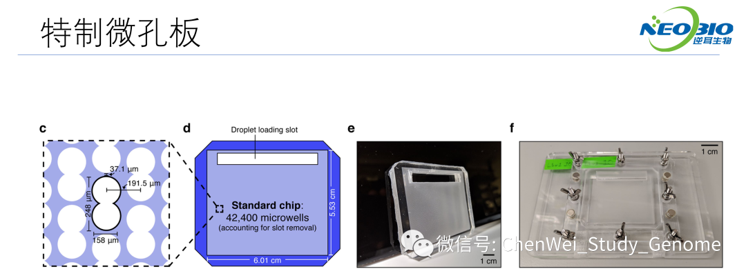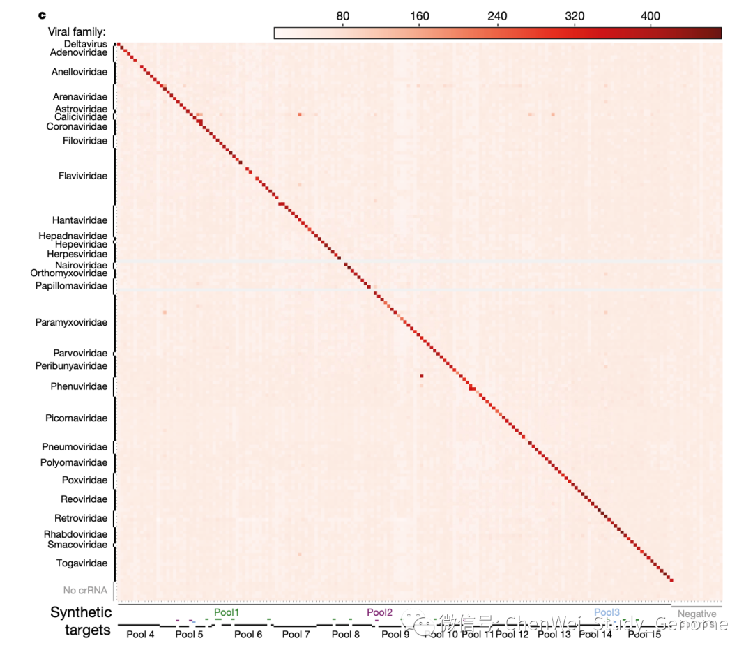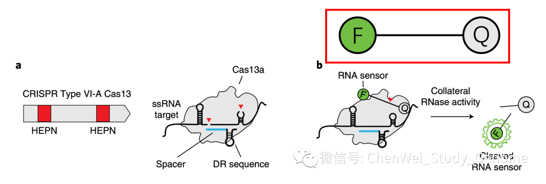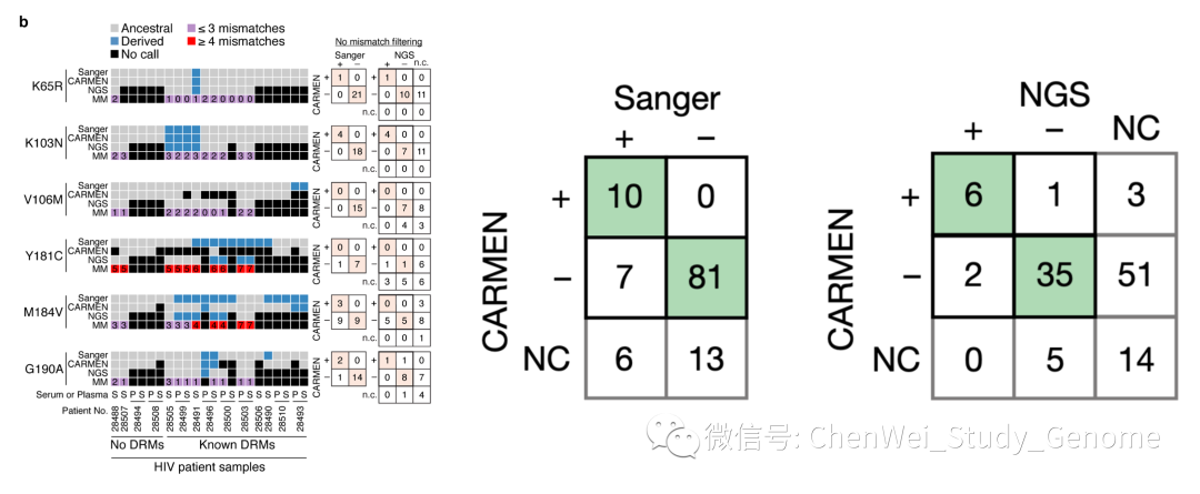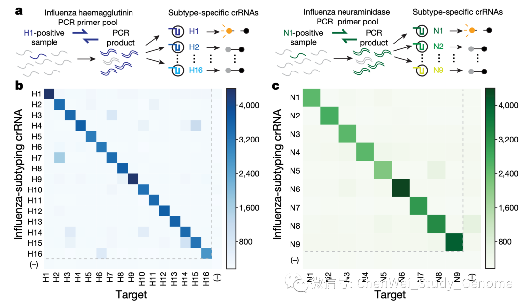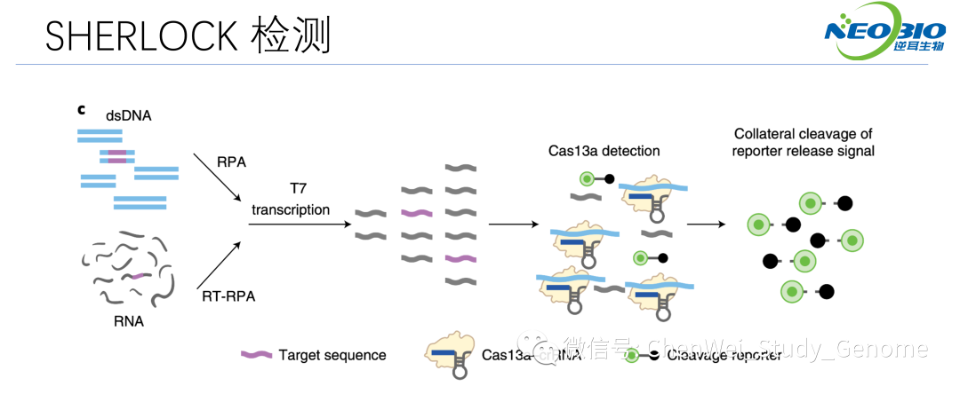 视频内容简介 1、CARMEN 是一种创新的快速、高通量、多病原体广谱检测的方法; 2、CARMEN 方法有较高的特异性和灵敏度; 3、CARMEN方法通过微流控乳浊液化、和彩色码两项技术,结合显微荧光扫描,极大地降低了广谱病原体检测的成本。作者自己的说法是把成本降低了 300 倍。 视频字幕内容 大家好!欢迎来到【陈巍学基因】。今天我给大家讲《高通量广谱检测病原体新技术:CARMEN》 今天,我们要讲的内容,分4个部分:1、文章概要;2、实验原理;3、实验结果;4、分析小结 我们先说第一部分,文章概要 文章的题目,是《Massively multiplexed nucleic acid detection with Cas13》。这篇论文发表在 Nature 杂志的 2020 年的 6 月刊上。 论文题目,翻译成中文,意思是《使用 Cas13 进行大规模多重核酸检测》。 论文中展示了一种新开创的技术:CARMEN 技术。CARMEN 是“Combinatorial Arrayed Reactions for Multiplexed Evaluation of Nucleic acids”的首字母缩写。 第二部分,我们来说实验原理 我们先要说一下 Cas13 这个酶和 SHERLOCK 检测。 先说 Cas13 这个酶。Cas13 酶和 CRISPR 反应中的 Cas9 酶是类似的,可以在 guide RNA 的引导下,识别目标核酸链,并切割目标核酸链。 但 Cas13 这个酶与 Cas9 酶不同的点在于,它切割的目标是 RNA 链,而不是象 Cas9 酶那样是切割目标 DNA 链。 并且,Cas13 还有一个特点,当 Cas13 酶结合到 guide RNA 和目标 RNA 结合的 它不仅可以切割目标 RNA 链,它还会切割附近的 RNA 链。 那么利用这种特性,就可以设计一类似 Taqman 的 RNA 探针。这个 RNA 探针一端连着一个荧光基团,另一端连着一个淬灭基团。 当这个 RNA 链是完整的时候,淬灭基团会熄灭荧光基团,那么这个 RNA 探针就不会发出荧光。 而当 RNA 被切断后,淬灭基团和荧光基团分开,荧光基团就会发出荧光。 那么当这个体系中的 guide RNA 有发生与目标 RNA 结合的时候,Cas13 就会切断这个荧光探针,被切断的探针就会发出荧光。 在了解了 Cas13 酶切割探针,发出荧光的原理之后,我们再来看 SHERLOCK 检测。 SHERLOCK 是“specific high-sensitivity enzymatic reporter unlocking”的首字母缩写。翻成中文,意思是:“特异性高灵敏度酶报告基因解锁”。 大侦探“福尔摩斯”的全名是: Sherlock Holmes。可见这里给这个检测方法起“SHERLOCK”这个缩写名,有借用福尔摩斯的侦探能力的意思。 SHERLOCK 的实验原理,先是把抽提得到核酸做扩增。对其中的 DNA 做 RPA 扩增,RPA 扩增是一个类似 PCR 扩增的反应,但它不需要做热循环,只要温度保持在 37-42°C 之间,就可以进行反应。 对 RNA,则是做 RT-RPA,也就是“逆转录 RPA”,结果会是得到扩增了的 cDNA。接下来,扩增出来的 DNA 和 cDNA,都经过 T7 转录酶的转录,转录出许多的 RNA 链。然后,加入 Cas13 酶、guide RNA 和荧光探针,进行反应。如果被检测的样本中存在与 guide RNA 相对应的目标 RNA,则荧光探针会被 Cas13 酶所切割,并发出荧光。 检测样本是否发出荧光,就可以判断样本中是否存在目标核酸链。进而可以推断样本中是否有特定的病原体。 在了解了 SHERLOCK 检测的方法原理之后,接下来我们来说 CARMEN 的实验设计。这是 CARMEN 实验设计的原理图。 实验中用到“Color code”。“color code”的意思是,几种颜色荧光,比例不同,组成一组排列组合。我把它翻译成“彩色码”。 以“红、绿、蓝”三种荧光组成的彩色码为例,每一种荧光颜色都随着加入的相应的荧光染料的增多,而荧光强度增强。比如,红色可以取 0,1,2,4,……,一直到 64,一共 8 种荧光强度。 同样,绿色和蓝色也可以同样取 8 种荧光强度,那么把三种颜色的荧光组合起来,有 8 的 3 次方种组合,也就是可以得到 512(8*8*8 = 512)种颜色组合。 用这些颜色组合对特定的溶液做标记,就叫“彩色码”。 作者,先把几种样本,分别完成前面的核酸抽提、扩增、和转录的工作。接着,每个样本分别用荧光染料标上彩色码。 注意一下,这里用的荧光染料的颜色是偏蓝绿色的。 然后,把这些用彩色码标记了的 RNA 溶液,分别通过微流控系统,制成油包水的乳浊液。 同样原理,把分别针对若干种病毒 RNA 的探针,做成检测混合液。然后把每种混合液也加入彩色码做好标记。但请注意,标记检测液的彩色码的颜色是偏红橙色的,是和之前标记样本的蓝绿色的色系是分开的。然后,把每种检测混合液分别做成乳浊液。 接下来,把这若干个样本的乳浊液、和若干种检测液的乳浊液混合在一起。 然后,把这个混合液加载到特制的微孔板上。 这个特制的微孔板,需要特别介绍一下。这个板,是用聚二甲硅氧烷(PDMS, polydimethylsiloxane) 制成的。这是一种软的、且透明的胶质的材料。 它的大小约是手机的大小。 板的上面,布满了小孔。我们把这些小孔放大来看,每一个小孔的样子象一个空心的“8”字。一个小孔正好能放下乳浊液中的两个微滴。 一块板子,有 4.24 万个这样的小孔。 在使用的时候,在微孔板上还会加盖一个盖板。盖板和这个微孔板之间可以用螺丝锁紧。盖板的作用是把微滴锁定在小孔中,让不同小孔之间的微滴在锁定之后不会交叉污染。 在把乳浊液加入到这个微孔板之后,乳浊液中的微滴进入微孔。一个微孔中,正好容纳两个微滴。 这时候,先对微孔板进行一次荧光显微扫描成像。 然后,进行电击。电击会使一个小孔中的两个微滴融合。 如果样本微滴中的 RNA,正好能被检测微滴中的 guide RNA 识别,就会激活检测微滴中的 Cas13 的酶