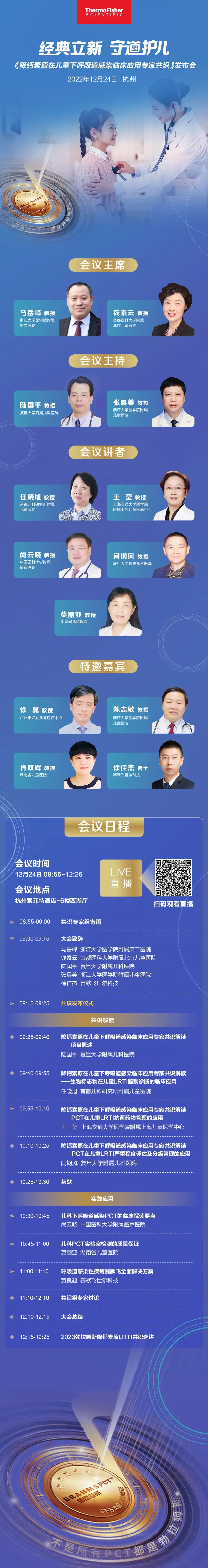 作为儿科医生,对于儿童下呼吸道感染(LRTI) 您是否有如下困扰: ▸如何根据血清PCT水平进行儿童细菌性LRTI 诊断和病原鉴别? ▸是否可根据血清PCT阈值指导儿童LRTI抗菌药物启动、调整及停用? ▸血清PCT监测时机和监测频率如何确定? ▸是否可根据血清PCT的水平进行LRTI门急诊分流? ▸新生儿细菌感染是否可以参考儿童血清PCT阈值? ▸…. 为解决这些临床问题,使血清PCT 更为合理、科学的应用于儿童LRTI 管理,《中华急诊医学杂志》组织儿童重症、急诊、呼吸、感染、检验等多个领域专家,共同完成“降钙素原在儿童下呼吸道感染临床应用专家共识”(简称为“专家共识”)。 2022年12月24日 在《中华急诊医学杂志》的支持下,赛默飞公司将在杭州举办“专家共识”发布会,并全程在线直播。共识组专家将带来共识内容的深入解读以及临床经验的深入探讨,真诚期待您的参与与聆听! 会议亮点 ➣大咖云集:共识组专家亲临会议解读勃拉姆斯降钙素原如何合理且科学的应用于儿童下呼吸道感染的管理 ➣智慧共研:特邀来自儿科呼吸、重症、急诊、感染、检验等各领域专家现场讨论,深入临床需求与应用 ➣焦点直击:剖析14大问题,直击五大主题:鉴别诊断、抗菌药物管理、动态监测、严重程度评估及疾病分流管理、结果解读 参会答谢 发布会直播期间,更有精彩互动与精美答谢礼 *礼品数量有限,详情参见互动规则,礼品以实物发放为准 以下是会议日程和参会方式,欢迎您的参与 |