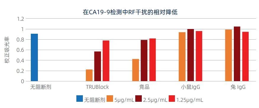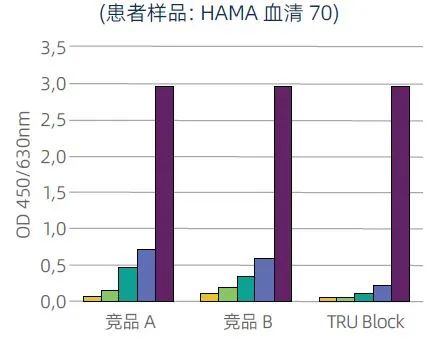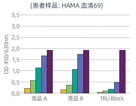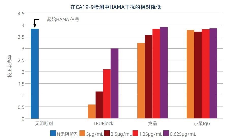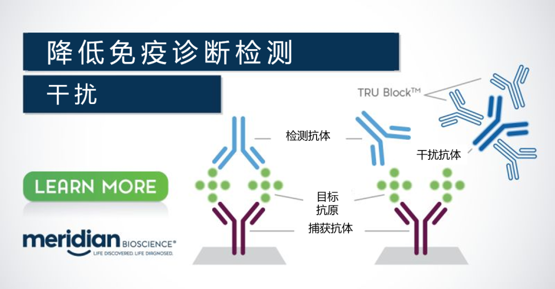 用于人体体外诊断(IVD)的免疫检测通常使用动物源抗体(比如鼠源性单抗)来识别特定的疾病标记物。但是,部分患者的血液中存在的抗该种动物抗体(比如HAMA)会与检测试剂中的动物源抗体发生反应,产生假阳性或者假阴性结果从而干扰诊断检测的准确性。 由于商用诊断免疫分析较多使用小鼠单克隆抗体, 所以HAMA干扰是最多见的一种类型。对其他动物的HA干扰如山羊 (HAGA)、绵羊(HASA)和兔子(HARA)的干扰,在使用来自这些动物的抗体进行免疫 检测时,也可能导至错误的结果。 除了HA,还有一种被称为类风湿因子(RF) 的干扰,是一种自身抗体, 可与患者自己的免疫球蛋白(IgG)发生反应, 也可能与动物Ig 交叉反应导至“RF干扰”, 这与HA/HAMA 干扰类似。 为了减少HA、HAMA和RF带来的检测干扰,IVD制造商经常使用动物血清或纯化的动物IgG,它们可以结合针对同一来源动物的低交叉反应抗体。 例如,小鼠血清,或小鼠IgG,它可以用 来阻止HAMA干扰。虽然小鼠IgG可以有效地阻断HAMA,但它也有一些局限性,包括: • 覆盖范围窄,只屏蔽HAMA,不屏蔽其他类型的HA干扰 • 不能阻断RF干扰 • 需要使用高浓度来达到充分阻断干扰的效果 • 主要阻断原理依赖于被动阻断技术 小鼠IgG和其他IgG通过提供替代结合位点阻止干扰抗体与捕获抗体或检测抗体结合。它们必须在高浓度下使用,通常浓度必须比检测抗体的浓度高出十倍以上,这可能对检测信号产生负面影响,且效果取决于干扰抗体与动物IgG的亲和力。因此,这对于一些需要降低检测成分用量的小型免疫检测中是一个挑战。 迈迪安开发的TRU BlockTM的免疫检测阻断剂是一种全新的HA、HAMA和RF阻断剂。TRU Block含有一种专门的结合剂,可以直接对抗抗体干扰,能够与HA、HAMA和RF高亲和力结合。 一旦与干扰抗体结合, TRU Block会通过位阻进一步阻止HA与其它试验成分结合。TRU Block的性能优势包括覆盖范围更广,可以阻断所有类型的HA和RF的干扰广,并且可以在低浓度下使用,与小鼠IgG相比具有更好的阻断效果。 TRU Block的阻断性能分别通过间接法(图 1)和直接法(图2)双鼠单克隆ELISA检测中进行评估。TRU Block,小鼠IgG和另一种常见的HA阻断剂,分别添加到样本稀释缓冲液中,对比他们的阻断效果。结果表明,在基于ELISA的免疫检测中,TRU Block的阻断性能优于小鼠IgG和其他商用阻断剂。 TRU Block也已成功用于化学发光检测和侧向流免疫检测中,干燥后用于样品垫和检测抗体之间即可。 性能对比– TRU Block vs 竞品 异嗜性抗体干扰阻断剂是临床免疫诊断检测中的重要组成部分,在很多批准的检测中出现误诊的案例已经证明了其重要性。 检测中使用的抗体的来源和可能影响检测的异嗜性干扰的类型是选择阻断剂是需要考虑的重要因素。 TRU Block是一种强大的HA、HAMA和RF干扰阻断剂,可用于ELISA、免疫层析和化学发光检测平台中。 与市场上其他HA阻段剂相比,它具有明显的性能优势,在免疫检测中可以更有效地降低假阳性和假阴性结果的可能性。 今日起至2022年底,订购任意一个阻断剂样品享75折,订购两个或以上阻断剂样品可享5折,现在就联系我们吧 |