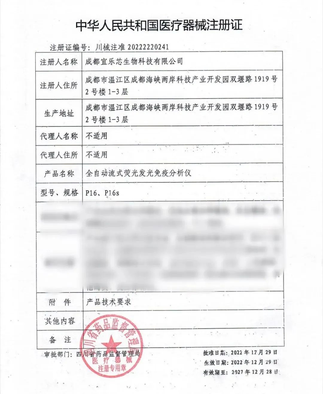 12月29日,宜乐芯全自动流式荧光免疫分析仪P16获四川省药品监督管理局医疗器械注册证(注册证编号:川械注准2022220241),批准正式上市销售!这是宜乐芯继全球最小发光后推出的又一款战略级重磅产品,充分体现了宜乐芯在IVD细分领域硬核的创新能力。 2021年四川省唯一创新IVD产品 全球首创单人份全自动流式荧光多重检 全自动:样本进、结果出,30个原始管进样位,随到随检; 单人份:单人份多指标耗材一体化分装,即开即用,无开瓶有效期; 多重检:经典流式荧光方法学,通过编码微球实现精准多联检; 速度快:最快760T/H,超越大型发光的检测速度; 高灵敏:细胞因子检测下限可达1pg/ml; 高精准:CV≤5%; 体积小:流式技术与POCT完美结合,xPOCT横空出世,应用场景多元; 全原研:自研编码微球、自研流式系统、自研细胞因子试剂盒,无惧封锁,尽在掌控。 近期,新冠导至的重症患者越来越多,细胞因子作为非常重要的重症监测指标,有着非常重要的临床价值,宜乐芯推出了4、7、12联检细胞因子检测试剂,灵敏度最高可达1pg/ml,配合P16全自动流式荧光,实现了真正的全自动细胞因子检测,可以为重症患者监测保驾护航。 检测项目 操作便捷 仅需3步 性能优越 关于宜乐芯 宜乐芯生物成立于2018年8月,致力于通过硬核创新,实现全链可控,为临床提供高性价比的临床免疫及分子诊断系统,力争在未来10年成为全球体外诊断细分领域的创新者。 创始团队在IVD行业耕耘多年,具有深厚的研发功底及产业化能力。通过突破上游核心部件、整合前沿科技、跨界组合创新、精准市场定位,实现差异化竞争,为客户提供5A级产品—Anytime,Anyplace,Anyone,Affordable, Accuracy。公司现有POCT全自动化学发光、全自动液相芯片、实验室自动化三大技术平台,在成都国际医学城有近4000平米的产业化基地。我们将持之以恒聚焦临床需求、推动价值创新,为客户提供极具竞争力的产品和服务,同时我们秉持开放合作,可以提供从仪器定制、试剂匹配、授权开放、CDMO委托生产、产品注册等一站式产品和服务。 |精准诊断 触手可及| 400-638-2018 联系人:方老师 19950307658 |