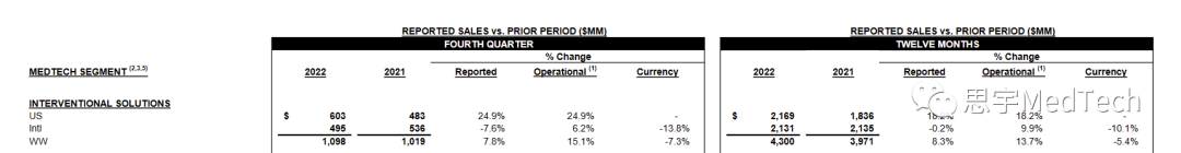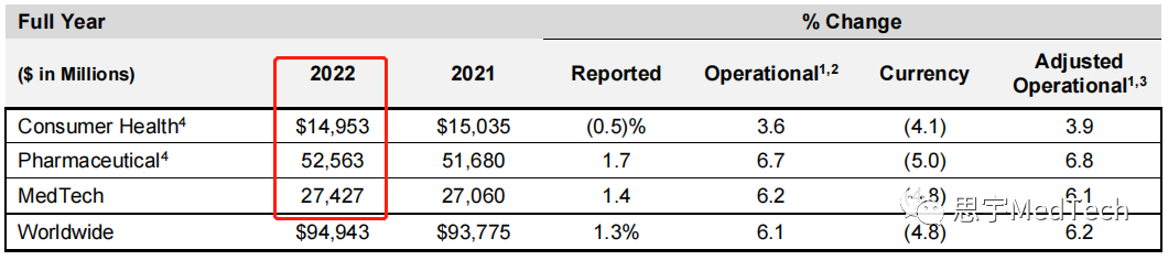 2023年1月24日,强生公司(纽约证券交易所代码:JNJ)公布了 2022 年第四季度和全年收益报告。 强生医疗器械2022年全年营收274.27亿美元,同比增长1.4%。其中外科手术、骨科、介入、眼科四类,分别占器械总收入的比例为35.33%、31.3%、15.68%、17.83%。 眼科和介入相对去年有所增长,脊椎、创伤、外科手术下滑。 在JPM23上,强生CEO Joaquin Duato在谈医疗器械业务时提到, 骨科,将把业务转移到增长更快的细分领域; 外科,将重点发展机器人和数字化外科; 眼科,将重点针对类似老花眼的领域。 并且对MedTech的增长有很强的信心。原话:the headline for me is that the MedTech market has significant potential and the MedTech market will continue to grow into the future. 2022年全年,强生总营收949.4亿美元,同比增加1.3%;(不计算新冠疫苗营收,2022全年营收927.64亿美元,同比上涨1.5%);净利润179.4亿美元,同比下降14%;全年每股收益为6.73美元,同比-13.8%。研发投入38.4亿美元,同比-18.6%,占总营收的16.2%。 (2022强生集团各业务营收数据) 丛业务范围来看,强生集团旗下共有三大业务板块收入分别为: 消费者健康业务:2022年全年营收149.53亿美元,同比下降0.5%。 (这是强生最后一次将消费者业务纳入其财报中,2022年9月,强生正式将旗下消费者健康产品部门分拆成为独立公司上市,新公司命名为Kenvue。2023年1月4日,强生宣布Kenvue将登录纽交所,并申请首次公开募股(股票代码为“KVUE”)。) 制药业务:2022年全年营收525.63亿美元,同比增长1.7%。 医疗技术业务(MedTech,也就是医疗器械部分): 2022年Q4营收67.76亿美元,同比下降1.2%。 2022年全年营收274.27亿美元,同比增长1.4%;占总收入比例28.9%。 (强生集团各大业务板块营收数据) 在医疗器械领域,强生的业务主要分外科手术、骨科、介入、眼科四类,分别占器械总收入的比例为35.33%、31.3%、15.68%、17.83%。收入情况如下: 外科手术领域,收入共计96.9亿美元,包括先进疗法(Advanced)45.69亿美元, 常规疗法(General)51.21亿美元。外科在器械总收入中占比35.33%。 骨科领域,收入共计85.87亿美元,包括髋关节15.14亿美元,膝关节13.59亿美元,创伤28.71亿美元,脊椎/运动及其他28.43亿美元。骨科在器械总收入中占比31.3% 介入领域,收入共计43亿美元,在器械总收入中占比15.68% 眼科领域,收入共计48.49亿美元,包括眼科手术13.06亿、隐形眼镜及其他35.43亿元。眼科在器械总收入中占比17.83%。 |