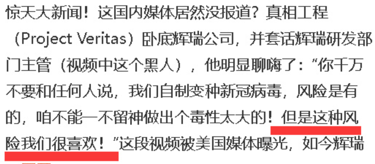 声明称,在辉瑞和德国生物新技术公司联合进行的新冠疫苗研发过程中,辉瑞并没有进行“功能获得”(gain of function)或“定向进化”(directed evolution) 研究。 真相到底是什么? 1、网络翻译错误,比如:“这是会有风险的,就好比……” 这是“辉瑞研发主管”在介绍病毒变异相关的信息时说出的半句话。之所以突出这一部分,是因为在国内微博上广泛传播的那个帖文,在翻译这部分时出现了一个明显的翻译错误,把“会有风险的,就好比…”翻译成了“我们喜欢这样的风险”。 (图为被国内的帖文错译的部分) 2、辉瑞被“碰瓷”了? 翻译成中文是:Project Veritas是由 James O'Keefe于2010 年创立的美国极右翼极端组织。该组织制作和编辑欺骗性视频,来诋毁主流媒体和官方机构。Project Veritas 还使用陷害采访者的方法进行不良宣传,并在其视频和操作中传播虚假信息和阴谋论。 公开资料显示该组织长期表现出反疫苗的态度,并曾经和一些反疫苗组织合作发布过让人们不要去接种新冠疫苗的内容。在新冠疫情期间,该组织还曾参与宣扬过大量反科学和反防疫的信息。 换句话说,这个机构本身就是个“渣”! 3、最后,作为科研工作者,构建病毒突变株是很常规的科研手段和方法,但都是假病毒 其次,全世界数不胜数的研究新型冠状病毒SARS-CoV-2血清学的机构,都构建了SARS-CoV-2的突变株,甚至许多机构预测性地构建了这些突变株,这就是所谓的“制造新冠突变株”。其中做得最好的是哥伦比亚大学ADARC的何大一组和北京大学的曹云龙组,他们的研究都发表在了顶级期刊。但他们构建的都是假病毒,不是能够传播的活病毒。 但是,但凡有人炒作这些常规操作,把它们编织成阴谋论,其“故事性“和“猎奇性”会引起不明就里的公众的关注。 信息来源:中国新闻网、环球时报、CC情报局,IVD学习笔记整理 |