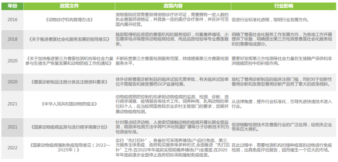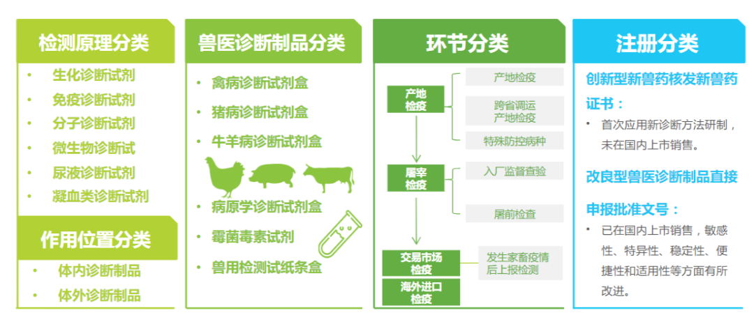 近几年,养殖企业对动物疫病诊断和动物疫病防治越来越重视,兽用诊断制品在动物疫病诊断和动物疫病防治中起到决定性影响。诊断制品是动物疫病防控和兽医科技发展的核心元素之一。经二十多年发展,历经化学、酶、免疫测定和探针技术4次技术革命,我国兽医检测诊断行业逐步发展,目前已有了行业自身明确的分类标准。兽用检测诊断行业相关法律法规政策推动兽医检测诊断行业创新及发展近年来,国家出台一系列法律法规、产业政策,对兽用检测诊断企业的生产、质量控制、经营管理、产品注册等方面进行监督、规范、管理,逐步打破进口企业在该领域的垄断地位,有利于兽用检测诊断行业的健康发展。未来创新能力和下游渠道能力将成为企业在兽用检测诊断行业脱颖而出,发展壮大的长期核心竞争力。