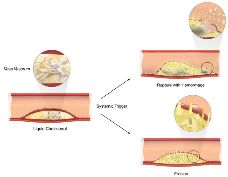 第一阶段(胆固醇结晶-诱导的细胞伤害和细胞凋亡) 局部细胞炎症导至形成富含脂肪的坏死核、一个易受伤害斑块的重要的特征(图3)。该过程由低密度脂蛋白(LDL)进入动脉壁启动,与细胞基质成分主要是甘油氨基聚糖,互相反应引起诱捕,甘油氨基聚糖对载脂蛋白B具有高度亲和力。而且,小而致密的LDL颗粒和基因上确定了血管亲和性,会是关键因子。这个步骤开始于循环血液中进入的单核细胞,转换为巨噬细胞,去吞噬LDL。由于胆固醇增强了巨噬细胞,使巨噬细胞成为泡沫细胞,最后形成了脂肪沟(streaks),造成形成坏死核。在泡沫细胞中,胆固醇结晶,激发一个危险信号,通过一个Nod-like受体NLRP3炎症蛋白,启动了局部的炎症响应。这个过程在形成动脉粥样硬化斑块阶段中,发生非常早。 细胞内的结晶可导至泡沫细胞死亡,促进局部细胞外增加胆固醇,来自细胞膜中以及它们较早吸收的胆固醇载量。这个物质然后形成富含脂肪的坏死核,一旦形成,成为局部脂质混有细胞碎片的堆积物,通常被称为“粥积累。”随着更多的巨噬细胞被趋化现象信号吸引到炎症位点,更多的脂肪被巨噬细胞吞噬,形成更多的泡沫细胞。许多巨噬细胞以后死亡后并释放它们的内含物,诱使更多的巨噬细胞到该位点,由此创立了一个邪恶的循环,最后形成一个饱和的脂肪库。而且,红细胞(RBC)从伤害的血管滋养层填充斑块,提供了更多的它们细胞膜的胆固醇,导至胆固醇浓度更大和饱和。血管滋养层也可被膨胀的尖锐胆固醇结晶伤害,释放RBC进入坏死核。而且,在软组织内游离细胞外胆固醇的存在,已经被证实作为慢性炎症的原因。 图3 伴随反复发作伤害的血管炎症的一个邪恶循环,导至形成一个坏死核和最后易受伤害的斑块。起始步骤是LDL进入动脉壁内,并截留,接着单核细胞进入,摄取LDL成为泡沫细胞。在泡沫细胞内的结晶诱导细胞凋亡,导至进一步吸引巨噬细胞,在动脉壁内形成一个细胞外的脂肪库。然后组成了一个易受损害的斑块基本成分。图各个分图下的说明:左上:LDL进入和截留;左下:形成泡沫细胞;中上:反复发作循坏;中中:坏死核形成;中下:在泡沫细胞内胆固醇结晶;右上:富含脂肪的坏死核的斑块;右下:泡沫细胞凋亡和细胞外脂肪的堆积。 一旦在内和外的易伸缩薄层间动脉壁的狭窄空间内,形成坏死核,然后它遭受局部的物理和化学力的影响。结果,饱和、温度、压力、和pH等,会各个或组合一起,去触发胆固醇在坏死核内的结晶。多个这些物理因素,已经在体外显示了,去触发胆固醇的结晶。更特异的,胆固醇分子的水化,是促发更大体积膨胀的局部因素。胆固醇单水类,已经被结晶图研究确认,作为在人致动脉粥样硬化斑块内的存在的主要胆固醇分子。这样,这些因素的各个或一起,可造成胆固醇结晶化,导至斑块破裂。这些观察也适合急性心血管综合征的未预料的临床表现,看来随着环境压力因素增加了,如:寒冷的气候或强体力活动。 第二阶段(胆固醇结晶诱导的动脉壁伤害) 这一阶段是由纤维斑块盖的危害所产生的全身性炎症。正如展现的,胆固醇结晶化导至坏死核体积的膨胀,可引起斑块破裂和/或糜烂。这个事件然后导至斑块盖的破坏,和叠加(覆盖)内皮,触发了一个系统的炎症响应(图4)。 图4 斑块破裂和/或糜烂的机制。由斑块盖扯裂诱导,导至破裂,在小坏死核的情况下,它导至糜烂。另外,创伤斑块内被斑块内胆固醇结晶伤害血管滋养管,引起斑块内出血。图中内容解释:左侧:血管滋养管;左下:液体胆固醇;中:系统触发;右上:出血破裂;右下:糜烂。 由淋巴在局部产生的白介素(IL)-6分子,是对内膜伤害的响应,然后循环到肝脏和激发产生hs-CRP,这是一个急性相反应素。 斑块破裂会突然地或缓慢地发生,依据脂肪库的大小。较大的脂肪库应趋向于产生突发破裂,因快速膨胀,经常见于男性;而较小的脂肪库应趋向于产生一个缓慢的、较持久的事件,引起糜烂,经常见于女性。他们已经在一个动脉粥样硬化的兔模型上展现了,连续喂食富含胆固醇食物,导至渐进增加hsCRP、IL-6、和纤溶酶原激活剂抑制剂-1。但是,一旦发生斑块破裂,生物标志物上升被考虑较高。 然后,问题来了,是否斑块释放的胆固醇结晶,是因与斑块破裂或事件的实际原因关联的一个被动的过程所致?证据的多个来源建议,这是被惹起的原因。首先,胆固醇结晶被注意到,穿刺内膜不仅在斑块破裂位点,而且在邻近的动脉壁,指示了是一个活跃的过程,涉及的位点超出了破裂点(图2)。而且,在其他冠状动脉内有多处斑块的破裂。第二,在体外研究已经展现了,当一个纤维膜置于不断膨胀的胆固醇结晶的路径处,膜被尖锐的结晶穿刺和扯裂。而且,组织学展现了破裂的纤维斑块盖被磨损的边缘,建议了一个动态的闪光如眼泪那样。第三,在一个动脉粥样硬化的兔子模型的斑块破裂和血栓形成中,存在的胆固醇结晶与血栓形成关联,若缺乏胆固醇结晶就没有血栓。第四,具有严重动脉粥样硬化的患者,但死于非心脏情况的,没有胆固醇结晶穿刺内膜表面。仅死于急性冠脉综合征的患者,具有胆固醇结晶穿刺内膜的证据。所以,我们假设,这个内膜伤害导至了一个系统的炎症响应。而且,我们的胆固醇结晶膨胀模式也解释了突发不断生长动脉粥样硬化斑块的,经常认可发生在患者。在相同患者,他的斑块可静止多年,然后突然出现,他的反复冠状血管造影
