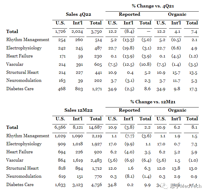 转载要求:请在文首标明文章来源,可直接转载 思宇MedTech 2023年1月25日,雅培(纽约证券交易所代码:ABT)公告了其第四季度业绩:雅培2022年全年营收437亿美元,同比+1.3%;有机增长+6.4%。 其中,诊断业务收入165.84亿美元、医疗器械收入146.87亿美元。 (雅培 Abbott公司商标) 2023年1月25日,雅培公布2022全年公司报告收入437亿美元,有机销售额增长6.4%。四大业务收入分别为:诊断165.84亿美元、医疗器械146.87亿美元、营养74.59亿美元、成熟药品49.12亿美元。 ▲雅培Q4和2022各业务营收情况(单位:百万美元,图片来自官网) 诊断业务是雅培的第一大业务,2022年全年营收占集团总营收的38%,达到165.84亿美元,同比+6%。诊断产品在第四季度的销售受到了新冠肺炎测试相关销售额同比下降的负面影响。从细分业务上看,增长主要由快速诊断(Rapid Diagnostics)+19%的高增长所驱动。从区域上看,主要由美国市场高达+21.3%的增长所驱动,国际市场营收下滑-6.8%。 2022内年市场释放了大量消极的信号,雅培在 2022 年伊始就不断面对诊断销售下降的预测。但实际与 COVID 相关的销售额接近 84 亿美元,相比 2021 年的 77 亿美元增长了 9%。 (雅培诊断营收数据(单位:百万美元)) 医疗器械业务是雅培的第二大业务,业务大致可以分为心血管领域医疗器械(节律管理、电生理、心衰、心血管、结构性心脏病)、神经调节、糖尿病护理三大领域。2022年医疗器械全年营收达到146.87亿美元,占集团总营收的34%,同比增长2.2%。 第四季度,医疗器械全球销售额与报告持平,有机增长7.4%。电生理、结构心脏和糖尿病护理领域的两位数强劲增长带动了美国的销售额增长。在国际上,销售增长受到中国间歇性新冠肺炎限制以及某些领域(包括电生理学和糖尿病护理)供应限制的负面影响。 雅培医疗器械组成如下: 心血管领域医疗器械:2022年收入91.61亿美元,包括: 节律管理21.19亿美元,电生理19.27亿美元,心衰9.2亿美元,血管24.83亿美元,结构性心脏病17.12亿美元。其中,结构性心脏病业务营收+6.3%,心衰业务营收+3.5%,电生理业务+1.1%,引领增长;节律管理业务营收下滑(-3.6%),心血管业务下滑(-6.4%)。 神经调节,2022年收入7.7亿美元; 糖尿病护理,2022年收入47.56亿美元。糖尿病设备是雅培最大、增长最快的医疗器械细分领域,其中大部分营收来自雅培Freestyle Libre连续血糖监测仪,其在第四季度的销售额约为11亿美元,其中美国增长超过40%。 2022年,雅培继续加强了其医疗器械产品组合,取得了多项最新进展,包括美国FDA的如下批准: