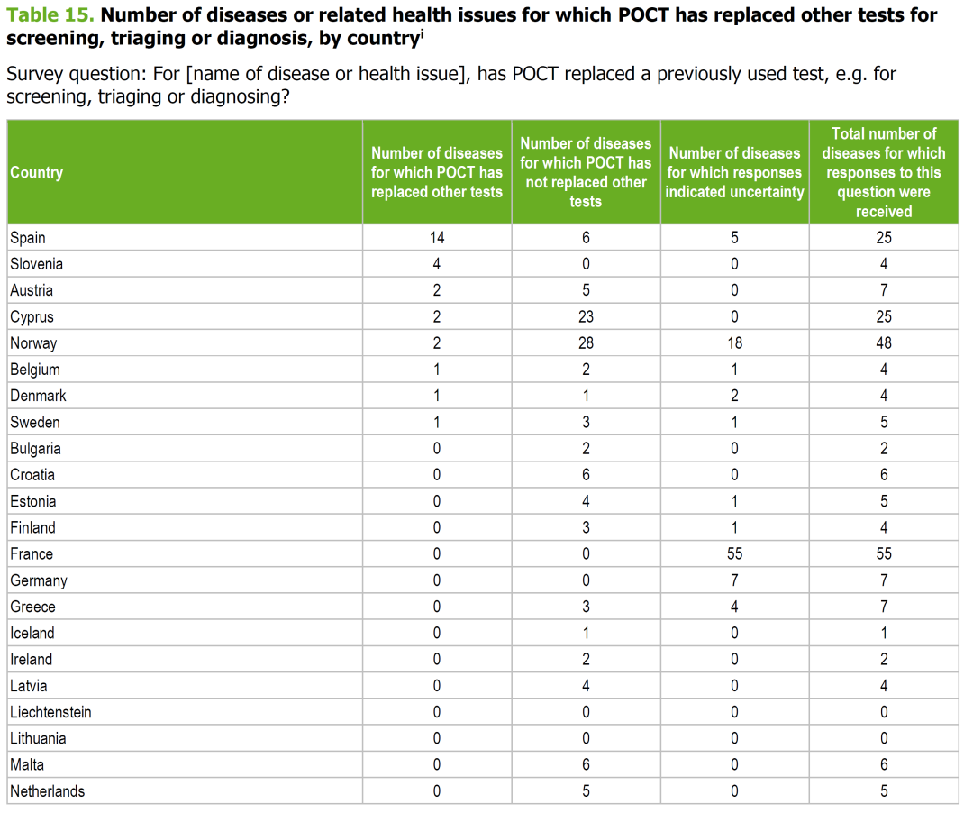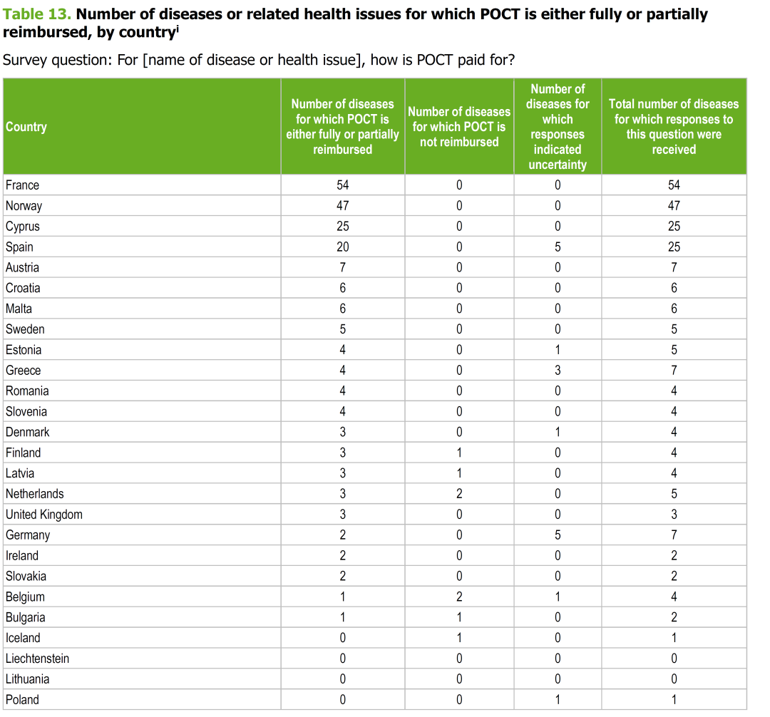 全球POCT市场可分为专业市场和自测市场两部分,而传染病检测约占14%的份额,并且以专业市场为主、自测市场为辅,产品主要用于医院、疾控中心及血站。2022年4月27日,欧洲CDC发布“Assessment of point-of-care testing devices for infectious disease surveillance, prevention and control – a mapping exercise”的技术报告,对POCT应用于传染病的预防和监测进行了综合评估,本文根据该技术报告对欧洲POCT传染病检测市场和概况进行简述。 1、56种传染病可用POCT检测 在欧洲的26个国家地区中,多达56种传染病可用POCT进行防控和监测,如流感、艾滋病、疟疾、军团菌、梅毒、衣原体感染等。 2、POCT用于传染病的常规检测政策 在欧洲地区,POCT用于传染病的常规检测在大部分国家地区均有相应的指南、推荐及诊疗意见等文件。不同地区存在差异,比如法国可用POCT检测的传染病多达55种,挪威高达44种,而西班牙只有25种、德国只有7种等。 3、关于POCT检测的医保支出政策 关于欧洲的医保支出,前期文章有具体数据。报告显示,POCT检测的传染病在大部分国家地区已纳入医保,其医保支出情况根据不同国家的经济和政策存在差异,如法国有54种传染病均可通过医保报销,挪威有47种传染病可医保报销,西班牙有20种传染病可报销,详情如下: 4、POCT代替传统检测方法的主要地区 在欧洲,至少有8个国家将传染病的检测方法使用POCT检测替代,其中西班牙已有14种传染病用POCT检测替代,斯洛文尼亚有4种、奥地利有2种等。相对于大部分国家而言,传染病的检测方法需要进一步进行确认。 5、POCT已代替传统检测方法的项目 据统计,欧洲至少有28种传染病的检测方法被POCT检测替代,如PCR、显微镜检查,尤其是细菌或病毒培养,如衣原体感染的抗原检测、培养法。报告显示,在POCT之前,部分国家的Q热检测需要到境外才能检测。 1、Point-of-Care Testing (POCT) Market (By Product Type: Covid -19 testing kits, Glucose monitoring products, Infectious disease testing products, Coagulation monitoring products, Pregnancy and fertility testing products, Others; By Platform: Lateral flow assays, Dipsticks, Microfluids, Molecular Diagnostics, Immunoassays; By Mode of Purchase: OTC products, Prescribed based products; By Testing Type; By End-User) - Global Industry Analysis, Size, Share, Growth, Trends, Regional Outlook, and Forecast 2022-2030 4、A scoping review of point-of-care testing devices for infectious disease surveillance, prevention and control |