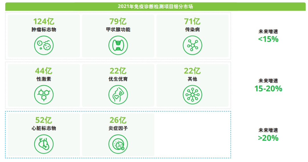 大家好,我是老刘,一个传播和分享IVD知识的人,前面写了一下如何写一篇优秀的行业报告,今天就对IVD市场最大的细分领域,免疫诊断做一下行业报告,套用之前的模板,如何写一篇优秀的免疫诊断行业报告。 免疫诊断市场情况 作为IVD领域最大最赚钱的细分领域,基本占了整个IVD的30%-40%的市场份额,对于公司而言,免疫甚至占比超过80%以上,可见,免疫市场,不管对于行业而言,还是公司而言,都是香饽饽。 1.1 免疫诊断技术发展 免疫诊断历经30多年的技术革新,化学发光已经成为了当前的主流技术。 数据来源:各个公司官网;德勤 1.2 免疫诊断市场情况 中国免疫诊断市场在过去五年整体保持约20%增速,预计2022年市场规模将达524亿。其中,中高通量市场占主导地位,规模达456亿(见图4)。相对于低通量市场所面对的急诊科或中小型医院,中高通量市场面对三级医院等大型医院客户,测试量较大且设备单价高,因此中高通量市场规模较大,贡献了大部分的免疫诊断市场体量,免疫流水线在三级医院普及率已经足够高,未来会下沉到二级以下市场,流水线会成为免疫诊断市场的战略高地,各家都是积极布局。 2018-2022年免疫诊断市场规模 免疫诊断背景政策分析 免疫市场如此高的市场份额,和背景政策密不可分,技术的升级,检测项目的扩大,医疗体系改革,国民健康意识提高等是密不可分的。 技术革新,替代进行时 “十四五”规划大力强调推进创新产品的开发和产业化,鼓励中国医疗器械创新发展。化学发光对酶联免疫的替代、仪器的模块化发展和流水线整合推动了三级医院市场的发展,引领免疫诊断行业高速增长。同时,国产厂家发展也将进一步推动免疫诊断市场下沉,让更多医院能配置诊断结果精准度高且成本低的免疫诊断仪器。 项目扩增,特色项目持续增香 目前,中国临床层面所开展的免疫诊断项目可达200多项,并在各级医院广泛普及,主要集中于肿瘤标志物、传染病、甲状腺功能等领域。相较于美国的常规检测项目,中国目前的常规检测项目仍有很大的扩增空间,而特色检测项目可望成为免疫诊断的增长驱动力。未来,在国家带量采购(VBP)及疾病诊断相关分组制度(DRG)影响下,常规检测项目竞争将愈加激烈,可能对价格造成冲击。 医改进行,基建扩大 自2015年国务院发表提倡提高基层医疗服务能力并完善分级诊疗的指导意见起,分级诊疗的落地在中国已有初步成效。“十四五”规划强调优质医疗资源建设和区域均衡分布,呼吁并贴息支持基层医疗能力建设。“千县工程”等针对基层医疗机构的政策出台后,基层医院和二级医院将拥有更多预算购买检测设备和试剂,中高端免疫诊断设备进入基层市场的大门逐渐打开。 健康意识提高 根据国家统计局公布,2021年全国居民人均可支配收入超35,000元,其中人均医疗保健消费支出2,115元,同比增长14.8%。这一现象说明居民更加愿意为保障自身健康医疗服务付费,全民对于健康消费的意识也愈发增强。健康体检、肿瘤早筛在全民健康体系的渗透提升了居民整体疾病诊断率,同时精细化的疾病管理模式扩大了免疫诊断的应用场景 免疫诊断竞争格局 免疫诊断竞争激烈,而进口厂家仍占据过半市场规模免疫诊断市场总体竞争格局较为集中,市场主要由罗氏、雅培、贝克曼、西门子(罗雅贝西)四家进口化学发光厂家领头。尽管国产替代加速,但进口厂商仍可达到市场占有率超55% 。具体市场情况及竞争格局而言,化学发光玩家因为其市场规模较大,占据免疫诊断市场过半份额。迈瑞、安图、新产业等以化学发光为主的厂商为国产免疫诊断第一梯队玩家,而万孚、基蛋、明德等更多布局在低通量检测厂家则为国产第二梯队玩家。 免疫诊断市场竞争格局(依销售额) 数据来源:案头研究,专家访谈,德勤分析 3.1 化学发光成主流,高通量引领行业发展 化学发光引领高通量市场增长,而进口厂家占据了七成以上的市场份额 国内居民可支配收入水平提高以及人民对疾病诊断预防和健康管理的需求增强带动整体市场的增长。同时在分级诊疗和医疗基建投入的改革下,免疫诊断在基层医院的需求快速增长。在过去五年中,中高通量市场以约20%增速在增长,预计2022年规模可达456亿人民币。其中化学发光因为其准确性高以及仪器自动化程度高等优势,已经替代酶联免疫成为主要技术,在2022年占据市场超85%份额,市场规模突破400亿关卡 2018-2022年中高通量免疫诊断市场规模 数据来源:案头研究,专家访谈,德勤分析 化学发光市场竞争格局(依销售额) 数据来源:案头研究,专家访谈,德勤分析 3.2 单人份国产品牌主力军 随着五大急救中心等医疗基建的落地,低通量免疫诊断仪器借其使用成本和检测速度上的优势,满足了临床应用上快速检测的需求,为低通量市场带来新增长点。同时,在技术发展下,检测项目的多样化发展以及检测技术的不断优化也将提高低通量仪器在临床使用上的价值和认可程度。在应用场景增加和技术迭代等因素影响下,2022年低通量市场可达68亿,在过去五年中稳步增长。低通量市场中主要以胶体金、免疫荧光等技术为主,其中胶体金技术因受准确度限制主要用于单人份的定性检测,而免疫荧光、时间分辨荧光等技术准确度较高,能够快速提供单人份定量检测结果。目前,单人份定量检测为低通量市场的主流,2022年单人份定量检测占据约80%份额。未来,单