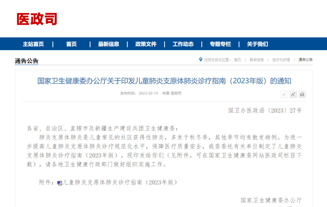 近日,国家卫健委发布《儿童肺炎支原体肺炎诊疗指南(2023年版)》,该指南明确指出,在符合临床和影像学表现的基础上,血清支原体抗体滴度≥160(PA法),病程中双份血清支原体抗体滴度上升4倍及以上;和/或支原体DNA或RNA阳性,即可诊断肺炎支原体肺炎。 儿童肺炎支原体肺炎诊疗指南 (2023年版) 肺炎支原体肺炎(mycoplasma pneumoniae pneumonia,MPP)是我国5岁及以上儿童最主要的社区获得性肺炎(community acquired pneumonia,CAP)。如何早期发现重症和危重症病例、合理救治、避免死亡和后遗症的发生是MPP诊治的核心和关键问题。为此,国家卫生健康委员会委托国家儿童医学中心(首都医科大学附属北京儿童医院)牵头撰写儿童MPP诊疗指南。国家儿童医学中心组织了国家呼吸病临床研究中心、全国儿科呼吸、重症、血液、影像、检验、药学等多学科专家,参照现有国内外证据和经验制定了本诊疗指南,以期指导和规范儿科医师对MPP的诊治,减少抗微生物药物的不合理使用,减少后遗症、降低病死率、减轻医疗负担等。本指南为总体指导性原则,各地各级医院在临床实践中应结合具体情况运用。 一、定义 肺炎支原体肺炎(MPP):指肺炎支原体(mycoplasma pneumoniae, MP)感染引起的肺部炎症,可以累及支气管、细支气管、肺泡和肺间质。 难治性肺炎支原体肺炎(refractory mycoplasma pneumoniae pneumonia, RMPP):指MPP患儿使用大环内酯类抗菌药物正规治疗7d及以上,仍持续发热、临床征象及肺部影像学所见加重、出现肺外并发症者。 大环内酯类药物无反应性肺炎支原体肺炎(macrolide -unresponsive MPP,MUMPP):指MPP患儿经过大环内酯类抗菌药物正规治疗72h,仍持续发热,临床征象及肺部影像学无改善或呈进一步加重的MPP。原因与MP耐药、异常免疫炎症反应以及混合感染等有关。临床及时识别MUMPP更有利于早期有效的治疗,减少重症和后遗症的发生。 重症肺炎支原体肺炎(severe MPP, SMPP):指MPP病情严重,符合重症CAP判定标准,详见临床分型。 危重症肺炎支原体肺炎:指患儿病情迅速进展、出现呼吸衰竭或危及生命的肺外并发症,需要进行生命支持治疗的少数SMPP。国外文献也将此类MPP称为暴发性肺炎支原体肺炎(fulminant MPP, FMPP)。 二、发病机制 发病机制尚未完全阐明,目前认为主要机制有两种:MP直接损伤和宿主异常的免疫应答反应。MP侵入呼吸道,利用黏附细胞器附着于细胞表面,通过释放氧自由基、社区获得性呼吸窘迫综合征毒素等机制造成呼吸道上皮的直接损伤;宿主对MP感染的异常免疫应答可通过自身免疫反应、过敏反应、免疫复合物形成等多种途径导至肺和肺外组织的免疫损伤。宿主异常免疫应答在SMPP、FMPP以及肺外并发症的发生中起了重要作用,也造成MPP临床和影像学的多样性。 三、病理表现 轻症肺炎肺泡腔内有中性粒细胞浸润,重症患者肺泡腔和肺泡壁还伴有淋巴细胞、浆细胞、巨噬细胞浸润,肺泡壁增厚和水肿,后期肺泡壁可发生纤维化,肺泡腔渗出物包括纤维蛋白以及息肉样机化组织。可发生肺泡出血。支气管、细支气管受累表现为上皮细胞坏死和脱落,纤毛破坏,管壁水肿,管壁及黏膜下淋巴细胞和/或巨噬细胞浸润,呈“套袖样”改变,也可有中性粒细胞浸润,管腔内浸润细胞类似肺泡腔,此外含有黏液物质,上皮细胞破坏后被增殖的成纤维细胞替代,后期管腔和管壁存在纤维化,导至气道扭曲和闭塞。 四、临床表现 MPP多见于5岁及以上儿童,但5岁以下儿童也可发病。以发热、咳嗽为主要临床表现,可伴有头痛、流涕、咽痛、耳痛等。发热以中高热为主,持续高热者预示病情重。咳嗽较为剧烈,可类似百日咳样咳嗽。部分患儿有喘息表现,以婴幼儿多见。肺部早期体征可不明显,随病情进展可出现呼吸音降低和干、湿性啰音。 SMPP多发生于病程1周左右,伴有肺内和肺外并发症,若出现塑形性支气管炎(plastic bronchitis, PB)、中等-大量胸腔积液、大面积肺实变和坏死、肺栓塞(pulmonary embolism, PE)等时,患儿可出现气促或呼吸困难;发生肺栓塞的患儿还可出现胸痛和咯血;发生肺外并发症时可出现相应脏器损伤的临床表现。肺外并发症可发生于皮肤粘膜、神经系统、血液系统、循环系统等,出现相应各系统受损的表现,常见肺外并发症见第十部分。 少数MPP可发展为危重症,常以呼吸困难和呼吸衰竭为突出表现,与急性呼吸窘迫综合征、大气道发生PB、弥漫性细支气管炎以及严重PE等有关。个别病例以严重肺外并发症为主要表现。 国内大环内酯类抗菌药物耐药的MP感染较普遍,可能是导至SMPP、MUMPP以及RMPP发生的主要原因之一。 五、影像学表现 影像学表现是临床判断病情严重程度和评估预后的主要依据之一。 MPP早期胸片或胸部CT主要表现为支气管血管周围纹理增粗、增多、支气管壁增厚,可有磨玻璃影、“树芽征”、小叶间隔增厚、网格影等。肺泡炎性改变则依肺泡受累的范围而异,可有磨玻璃样阴影、斑片状、节段乃至大叶性实变,常见肺不张,可伴有肺门影增大,重者可合并胸腔积液。单侧病变较双侧多见,病灶内可伴或不伴支气管充气征,肺实变时呈现中-高密度阴影,实变面积越大、受累肺叶越多则密度越高。多种形态、大小不等和密度不均的病灶可混合出现。可伴有黏液嵌塞征。 部分MPP可表现为局限或弥漫性细支气管炎特征,胸部高分辨CT(HRCT)显示为小叶中心结节影、“树芽征”、分支样线条征、细支