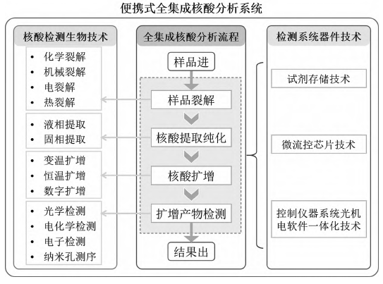 如图 1 所示,核酸靶标的检测通常需要样品裂解、核酸提取纯化、核酸扩增和扩增产物分析这几个步骤。