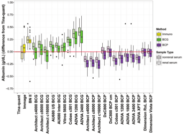 CC的白蛋白检测问题 冯仁丰 背景:血清和血浆白蛋白的检测被广泛地用于医学,包括在肾透析中心中病人护理质量的指示。 方法:收集没有肾病病人的血清(n = 50)、血浆(n = 48),肾衰病人血液透析前的血清(n =53)例。所有样品和ERM-DA470k/IFCC参考物质(RM),以3个免疫化学、9个溴甲酚绿(BCG)、和12个溴甲酚紫(BCP)方法检测。 结果:3个免疫化学程序的2个、9个BCG的5个、和12个BCP的10个方法,回收的RM值在它的不确定度内。一个免疫化学和3个BCG方法相对于RM值有偏移。所有检测程序的随机误差成分很小。选定Tina-quant免疫化学程序为参考检测程序,这是依据回收率和误差分析结果。BCG对于Tina-quant的平均偏移为1.5%到13.9%,在较低白蛋白浓度处更大。BCP方法的平均偏移为-5.4%到1.2%,无论白蛋白浓度。在所有方法类型中,血浆样品的偏移一般高于血清样品。对大多检测程序,进行血液透析病人相对于无肾病病人的血清,偏移较小。 结论:在免疫化学、BCG和BCP间显著差异,影响了血清白蛋白结果的解释。在临床管理肾病和其他疾病的指导和计算,必须考虑进行白蛋白检测的方法,直至实现一致性。 讨论 检验医学溯源性联合委员会(JCTLM)列出了依据免疫检测原理的透射比浊或散射比浊原理,去检出免疫复合物作为血清中白蛋白的一个RMP(20)。ERM-DA470k/IFCC被列为免疫检测校准的一个认证 RM。我们使用Tina-quant透射比浊免疫化学检测程序作为RMP,去确定检测程序和样品类型间的相对偏移,因为它在RM中具有出色的白蛋白回收,和很小的随机误差成分。在其他2个免疫化学方法间,Immage散射程序具有与Tina-quant详细的性能,但BN II对于RM值和Tina-quant程序,在所有样品类型中有显著的正偏移。这些观察隐含了BN II的校准是不正确的,使用一个免疫化学检测原理不可确保白蛋白的准确结果,除非校准溯源性被验证。 一般,BCG方法与BCP方法相比有较高的偏移。BCP方法对于RMP的平均偏移较小,并比例误差的大小不随浓度改变。相反,BCG方法对于RPM的平均偏移较大,呈比例误差随白蛋白浓度而异,在白蛋白较低浓度处有较大的正偏移。另外,在BCG方法与BCP方法间的比较,有较大范围的差异,说明BCG方法在很大程度上被其他样品中的蛋白或物质影响,超过BCP。 依据生物变异指标,在整个生理上合理的浓度范围,没有一个BCG方法符合偏移的最低性能规范。但12个BCP方法的8个符合了偏移的最低性能规范,没有这样的BCP方法的偏移通常比BCG方法观察到的要小。我们的数据说明,BCP方法对白蛋白有较好的选择性,具有比例偏移,看来结果的一致性可以达到。但是BCG方法随浓度变异的偏移和非选择性,隐含了实用BCG技术不可被一致,应从临床实验室中消除。 使用肝素处理的血浆的检测,在BCG方法中产生错误结果,已在以往报告中观察到(24,25)。本研究的的所有检测,除了Immage散射程序外,均被美国FDA批准,可使用血清和肝素化的血浆样品。我们的观察建议,特异性问题与肝素化样品有关,将继续是近期产生的BCG方法的问题。 24个检测程序中的19个,声明具有校准溯源性到ERM-DA470k/IFCC或它predecessor的ERM-DA470血清的RM。在实施校准溯源性做法中的差异,看来归因于偏移。但是肾病的还是非肾病的在血清或血浆间,结果的差异也支持了白蛋白方法,作为suffering因选择性的局限性,在样品类型间也不同。 血清和血浆白蛋白使用染料技术实现一致的结果,将要求规定单一试剂类型。我们的数据支持BCP作为优选的方法,因为相对偏移小于BCG方法,并在整个检验的浓度区间是恒定的,但BCG方法在整个浓度区间不呈比例的偏移,使得标准化不可能。 所有BCP和9个BCG方法的6个,回收ERM-DA470k/IFCC RM靶值很相似。病人样品和未稀释的和稀释的RM,免疫化学的和BCP对于RMP结果,具有类似的关系,看来RM适合用于这些方法。但是,稀释的RM结果在BCG方法,具有值得注意的不同关系,所以,稀释的RM会在BCG方法中,与病人样品不可互换。我们不知道,在校准溯源性方法中稀释了RM被厂商使用;如果使用了稀释的物质,BCG方法具有了互换性的问题。原先预期使用RM分析证书声明是,为校准免疫检测程序,包括关于对染料结合方法的minimal信息,建议了对特定检测程序使用应予以确认。需要进一步研究去确定RM为染料结合白蛋白检测程序的互换性特性。 白蛋白检测程序偏移的差异对病人诊疗有影响。美国的国家肾脏基金会关于慢性肾衰竭的营养指南(The National Kidney Foundation’s guidelines on nutrition in chronic renal failure) 建议进行肾透析病人的白蛋白常规检测(11,26)。在美国的Medicare和Medicaid服务中心,设定了透析病人护理的标准(27)。与前述指导(11)一致,目标(28)是:使用BCG方法检测的(或以BCG方法为(实验室正常的))白蛋白浓度≥ 4.0 g/dl(40 g/L)。 2016年,透析中心被预期,在38%治疗病人中达到白蛋白高于40g/L(29)。对血清白蛋白<35 g/L的病人,中心必须说明证据,计划改善营养。对于病人白蛋白低于该指导值的,应aggressive强烈补充蛋白(30)。补充会不利地影响无机磷、钾、和其他电解质,补充的费用和个人的时间通常nonreimbursable,还没有说明对明确的死亡率好处(31,32)。白蛋白检测没有标准化,使大量透析病人遭受未被证实和耗费治疗的风险。 白蛋白检测程序的选择,肾病样品百分数上产生了很大的差异,与本研究目标一致。BCG方法间,白蛋白目标是≥ 4.0 g/dl(40 g/L),以Advia 2400检测,有32%的样品符合,但以Architect 