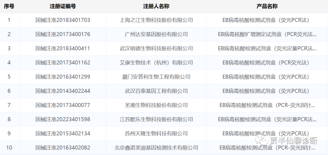 上海临检中心的王老师分享了上海市可直接备案的120项核酸检测类项目清单:上海市可直接备案的核酸检测类项目清单(截至2023年2月) EB病毒是一种线状DNA病毒, 主要感染人的淋巴细胞和上皮细胞,90%以上的成 年人都曾感染并终生携带该病毒。 02 EBV临床意义 EBV感染后会引起多种疾病,包括急性感染、慢性感染和恶性肿瘤。 1) 传染性单核细胞增多症(IM) IM是一种急性淋巴组织增生性疾病,多见于青春期初次感染EBV后发病,其临床表现为发热、咽炎、淋巴结炎、脾大、肝功能异常、外周血中单核细胞和异型淋巴细胞大量增多。 普通人群中,IM年发病率约为0.5%。15~24岁之间的青少年和青年人发病率最高,青年人的年发病率为0.9%~4.8%。 2)移植后淋巴细胞增殖症(PTLD) PTLD是实体器官移植或骨髓移植、造血干细胞移植后发生的一种严重并发症,是移植后持续免疫缺陷下发生的一种由增生性到肿瘤性的淋巴系统增殖。 大约80%-90%的PTLD与EBV感染有关,移植患者监测EBV感染至关重要。 EBV特异性抗体检测价值有限;血浆中EBV-DNA载量检测有助于评估PTLD治疗效果。 3) 鼻咽癌 鼻咽癌是与EBV密切相关的一种常见上皮细胞恶性肿瘤。多发生于40岁以上中老年人,我国南方(广东、广西、福建等)及东南亚是鼻咽癌高发区。 鼻咽癌的活检组织可检出EB病毒的DNA及核抗原;其血清中亦含有较高滴度的EB病毒特异的VCA-IgA或EAIgA抗体。 此外,EBV还引起慢性活动性EBV感染(CAEBV)和EBV相关噬血细胞淋巴组织细胞增多症(EBV-HLH)等非肿瘤性重症EBV相关疾病。EBV也是一种致肿瘤病毒,与许多肿瘤的发生相关,如霍奇金淋巴瘤(HL)、非霍奇金淋巴瘤(NHL),胃癌等。 03 EBV检测指标 目前实验室用于检测EB病毒的方法主要是血清学方法和核酸检测(PCR)方法,血清学方法对于EB病毒感染相关疾病的诊断有着重要意义,但是不能监测疾病的发展与转归。 EBV编码多种结构抗原,包括病毒衣壳抗原(VCA)、早期抗原(EA)、膜抗原(MA)、核抗原(NA)等,机体感染EBV后针对不同抗原产生相应抗体,根据其产生的时间可以判断原发感染还是既往感染。 除此之外,VCA-IgA和抗EA-IgA阳性提示持续性EBV抗原刺激,常应用CAEBV和EBV相关肿瘤的诊断和监测。 PCR方法可以直观地反映病毒的存在,灵敏度高,在临床EBV感染性疾病诊断中发挥着重要作用。 不同的检测方法和标本类型都有着不同的临床意义和适用范围,因此对这些方法进行正确的选择非常重要。 相对来讲,EBV的检测指标与相关疾病还是复杂的。我也把一些EBV相关疾病文献及检测诊断标准放在了星球,有兴趣的可以多看看。 04 EBV DNA检测竞争格局 EBV检测产品数量不算多,在NMPA官网输入“EB病毒”展示了86条信息,而PCR产品相对来说就比较少了,只有10条信息,如下: 1)达安基因