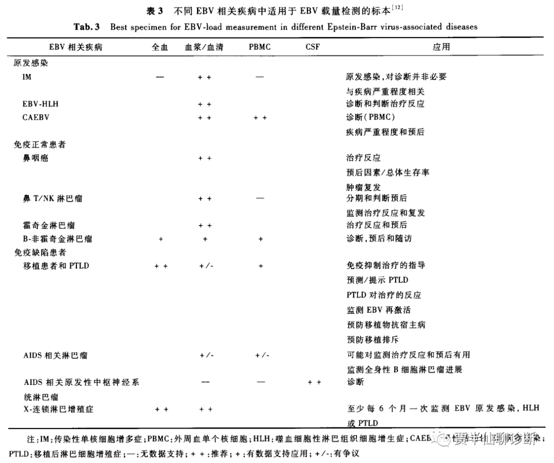 《EB病毒感染实验室诊断及临床应用专家共识2018》血清或血浆中EBV-DNA阳性提示患者体内存在活动性EBV感染或疾病与EBV密切相关(如原发EBV感染早期、EBV-HLH、大多数CAEBV、EBV相关肿瘤等),需结合临床表现及其他结果综合分析判断。血清或血浆EBV-DNA阴性提示为血清阳性转化的EBV健康携带者、未感染过EBV的患者、非EBV相关疾病患者、以及部分EBV相关疾病患者,如部分IM患者及IM后期,极少数CAEBV患者(结合血清学判定)。外周血PBMC中的EBV-DNA载量高于10E2.5拷贝/μg DNA是CAEBV的诊断标准之一。全血样本EBV-DNA载量主要用于免疫缺陷患者EBV感染的诊断,以提高诊断EBV感染的敏感性,不推荐用于有免疫力的患者。因血清EBV阳性转化的健康携带者每10E6个PBMC中大约有1~50个EBV感染的细胞,约7个拷贝(1~30个拷贝)EBV-DNA/10E6PBMC。因此,血清阳性转化的EBV健康携带者的全血或PBMC标本中可能检出低水平的EBV-DNA载量。首先说EBV DNA不背这个锅,不是我不温不火,是99%的分子检测项目都不火。疫情前分子诊断只占检验科收入的10%左右,而且集中在三级医院。 应用场景也有限,体量大的有肿瘤伴随诊断如EGFR,遗传疾病如NIPT,传染性疾病如HBV,药物基因如华法林等。 总体就是体量小,项目多,场景杂。从EQA数据看,EBV DNA检测也算是开展医院比较多的项目了。后续分子实验室大基建完成,EBV DNA检测会增加吗?会的。在上一篇文章中已经提到了EBV与多种疾病相关,下文还会写些新的方向,一个检测项目的预期用途太广有时候真不见得是什么好事,无从下手。 即便在应用比较成熟的鼻咽癌领域,EBV DNA在早期诊断,治疗方案制定与调整,治疗后复发与进展等方向有广泛的应用。但EBV DNA在阈值设置上还存在差异,各研究组标准不统一。 我整理了近3年EBV在鼻咽癌、器官移植、儿童疾病,肠道等领域的专家共识,放在了知识星球,有兴趣的可以看看。 更多专家共识及诊疗方案的确定,使得EBV DNA应用也会越来越规范。 在各种学术会议上,EBV DNA的宣传力度是不够的。我只记得专题讲解EBV感染还是在2019年的《第六届临床微生物与感染病学国际论坛》。 其他的分子诊断厂家在宣传EBV DNA检测上也是零星的。没有过饱和宣传,也就无法有效触达。
