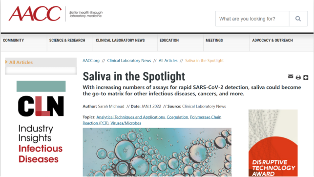 根据《Saliva in the Spotlight》的报道,唾液有可能成为一种新的焦点样本:"新冠大流行以及对快速、可靠检测的需求,提高了人们对唾液作为传染病方便、可靠检测介质的兴趣。最近的研究还表明,在传统的SARS-CoV-2 PCR测试中,唾液与鼻咽拭子一样有效,在家庭快速抗原测试中也很有用”。