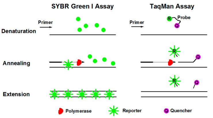 | 在学习过程中,我们经常会遇到各种PCR字眼,什么qPCR、RT-PCR、RT-qPCR、Real-Time PCR,好多同学看的头晕眼花也没弄明白这几种PCR有什么区别,那你呢?你了解PCR这个大家族吗?还在傻傻分不清吗?PCR是聚合酶链式反应(Polymerase Chain Reaction)的简称,是一种体外扩增特定DNA片段的分子生物学技术。PCR技术自问世以来,在生物科学领域、分子诊断领域、亲子鉴定、法医鉴定以及犯罪调查等方面发挥了巨大作用,是迄今为止最为重要的技术之一。经过演化和革新,PCR技术已经发展了三代:普通PCR技术、实时荧光定量PCR技术(qPCR)以及数字PCR(dPCR)技术。图1 PCR仪器的发展历程(Lee NY., 2018)PCR的基本原理与DNA的体内复制相类似,其特异性依赖于与靶序列两端互补的寡核苷酸引物。PCR由变性、退火和延伸三个基本反应步骤构成:①模板DNA的变性:模板DNA经高温(95℃左右)加热一定时间后,使其解离成单链,以便它与引物结合;②模板DNA与引物的退火(复性):将温度降至55℃左右时,引物与模板DNA单链按碱基互补配对的原则结合;③引物的延伸:再将温度调至72℃左右(DNA聚合酶最适反应温度),DNA模板和引物结合物在Taq DNA聚合酶的作用下,按碱基配对与半保留复制原理,沿着磷酸到五碳糖(5'→3')的方向合成一条新的与模板DNA链互补的半保留复制链。这样经变性、退火和延伸重复若干个循环后,就能将待扩目的基因扩增放大几百万倍。图2 PCR的基本反应步骤(图片源自:Wikipedia)普通PCR即一代PCR,使用普通PCR扩增仪扩增靶基因,并通过琼脂糖凝胶电泳对产物进行定性分析。2.实时荧光定量PCR(Quantitative Real-time PCR, qPCR)实时荧光定量PCR,也叫Real-Time PCR,即二代PCR,是指在PCR扩增反应体系中加入荧光染料或者荧光基团,在整个PCR过程中通过收集荧光信号实时监测每一个循环中扩增产物量的变化,最后通过标准曲线和CT值对待测样品进行定量分析。qPCR常用的有两种方法:SYBR Green法和TaqMan探针法。①荧光染料法(SYBR Green):SYBR Green Ⅰ是荧光定量PCR中最常用的荧光染料,它能与所有的双链DNA结合。在PCR反应体系中,加入SYBR Green Ⅰ,它就会在过程中与双链DNA结合,从而产生荧光信号。因此,反应中发出的全部荧光信号就会与反应中双链DNA的量呈正比,荧光强度也会随着产物的增加而增加。但是由于染料与双链DNA是非特异性结合,因此可能产生假阳性的结果。优点:价格相对较低;使用方便;对DNA模板没有选择,通用性好;检测灵敏度高。缺点:可能产生假阳性结果,需要通过熔解曲线分析识别扩增产物的特异性;需要不断优化反应体系以降低非特异性扩增;不适合进行多重qPCR检测。②荧光探针法(TaqMan技术):TaqMan探针是最早用于定量的方法,也是临床检测中最常用的检测方法。PCR扩增时,加入一对引物的同时再加入一个特异性的荧光探针。该探针是一个寡核苷酸,5'端标记一个荧光报告基团(Reporter, R),3'端标记一个淬灭基团(Quencher, Q)。当探针完整时,报告基团发射的荧光信号被淬灭基团吸收,以至于无法检测到荧光信号;而当PCR扩增时(在延伸阶段),探针会被Taq酶的5'→3'外切酶活性酶切降解,使报告基团和淬灭基团分离,报告基团发射底的荧光不会再被吸收,从而可以在荧光监测系统接收到荧光信号,即每扩增一条DNA,就形成一个荧光分子,PCR产物的形成与荧光分子的形成完全同步,PCR产物越多,荧光信号累积的越多,荧光强度越大。优点:检测特异性强;灵敏度高;适合进行多重qPCR检测;PCR后续无需处理,节省时间和原料成本。缺点:需要根据不同的序列,合成不同的探针;探针的水解依赖Taq酶外切酶的活性,定量时容易受试剂和酶性能影响;淬灭难以彻底,本底较高;检测结果很难判断实际的扩增特性。图3 荧光染料法和荧光探针法的工作原理(Cao et al., 2020)注:多重PCR,也称多重引物PCR或复合PCR,是在一个反应体系中加入两对以上引物,同时扩增出多个核酸片段的一种新型PCR扩增技术。3.数字PCR(Digital PCR, Dig-PCR, dPCR)数字PCR即三代PCR,是对原始PCR的另一种改进,是一种能够实现核酸绝对定量的精准检测技术,基于泊松分布原理将核酸样品分配到大量独立、平行的微反应单元(纳升级)中,使每个反应室中平均只有一个拷贝或者没有目标DNA分子,然后加入荧光信号进行扩增,从而实现靶标核酸分子的绝对计数,提高检测灵敏度和准确度。4. 逆转录PCR( Reverse T ranscription - PCR , RT - PCR)逆转录PCR也叫反转录PCR,将RNA的反转录(RT)和cDNA的聚合酶链式扩增相结合,是PCR的一种广泛应用的变形。在RT-PCR中首先经反转录酶将一条单链RNA逆转录成cDNA,再以cDNA为模板,扩增合成目的片段。作为模板的RNA可以是总RNA、mRNA或体外转录的RNA产物。无论使用何种RNA,关键是确保RNA中无RNA酶和基因组DNA的污染。RT-PCR技术灵敏且应用广泛,可用于检测细胞中基因表达水平,细胞中RNA病毒的含量和直接克隆特定基因的cDNA序列。一般通过一步法或两步法进行,一步法是RT反应和PCR反应在同一试管中进行;而在两步法中两个反应是分开依次进行的。5.实时荧光定量逆转录PCR(Real-time RT-PCR, RT-qPCR)Real-time RT-PCR是qPCR和RT-PCR的组合,其中的“RT”是Reverse transcription(逆转录)的意思,所以RT-qPCR就是结合了荧光定量技术的逆转录PCR,即以mRNA或总RNA为模板,先反转录得到cDNA,再以cDNA为模板,通过荧光定量PCR进行定量检测分析。因为RT-PCR只可以定性,但不能进行定量分析。与RT-PCR一样,RT-qPCR定量分析RNA也有两种方法: