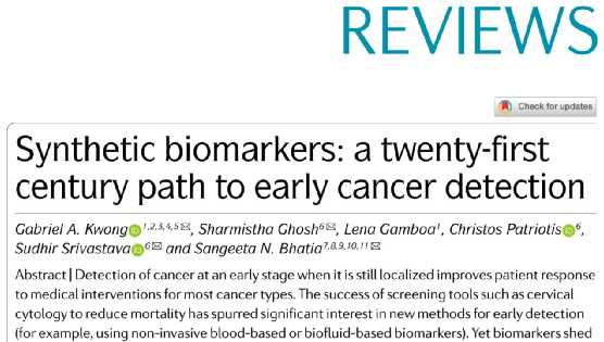 1.Synthetic biomarkers: a twenty-first century path to early cancer detection. Nat Rev Cancer. 2021 Oct; 21(10):655–668.