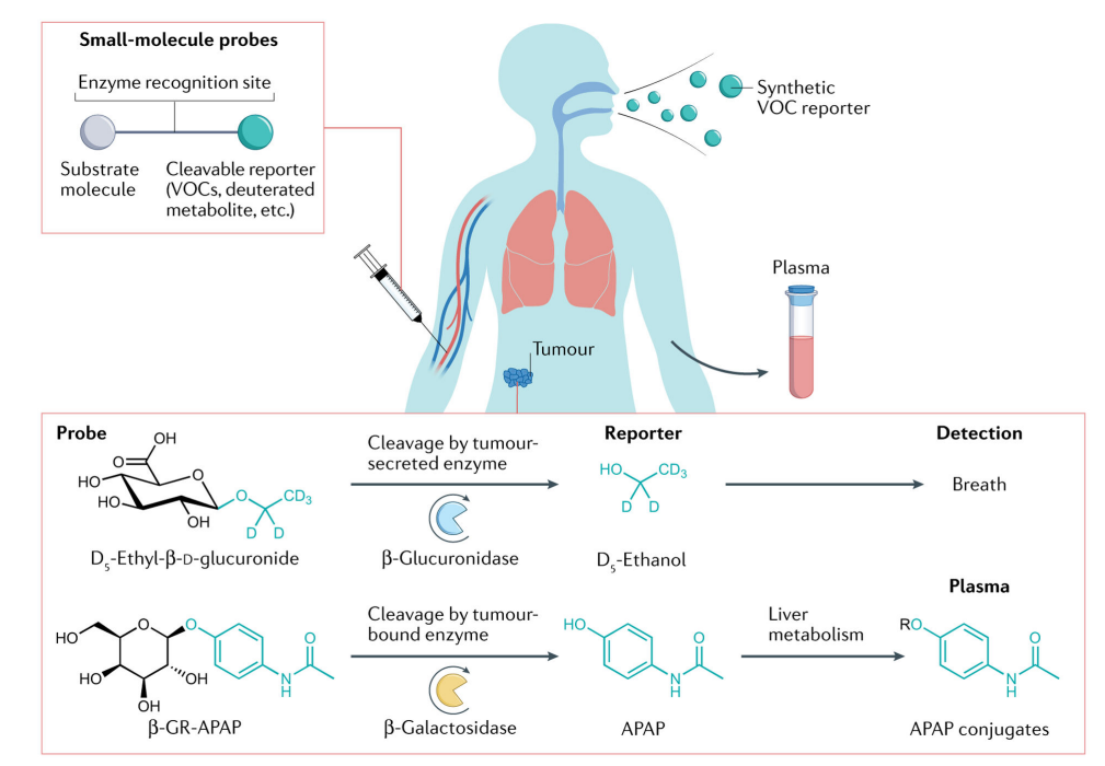 患者呼吸样本中存在的天然挥发性有机化合物(VOCs)也已用于癌症诊断。Lang等人使用了一种同位素标记的合成VOC,称为“D5乙基-β-D-葡糖苷酸”(EtGlu),它是乙醇的氘化代谢物。静脉注射后,EtGlu通过β-葡萄糖醛酸酶(一种由实体瘤分泌的胞外酶)酶转化为D5乙醇,然后通过气相色谱结合高分辨率质谱从呼吸中检测。