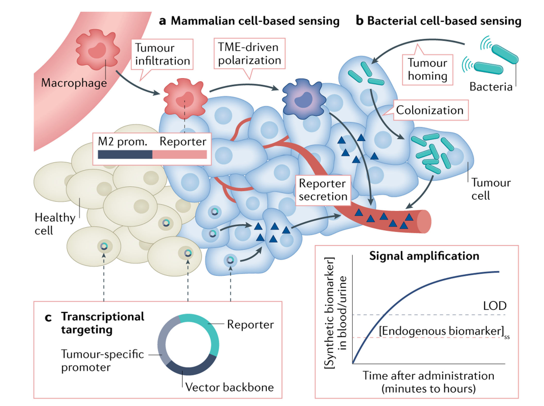 基于载体的系统依赖于两个关键设计组件:一个组织选择性或癌症选择性启动子来驱动转录,一个合成生物标记物被设计成分泌到血液或尿液中用于检测。组织选择性启动子提供了第一水平的特异性,例如正常沉默的人类端粒酶逆转录酶(TERT)的启动子,它编码端粒酶,端粒酶在癌细胞中经常被激活以实现增殖永生,这是癌症的标志之一。由于TERT在约90%的人类癌症中高水平表达,但在几乎所有的体细胞中都被沉默,因此TERT启动子已被用于驱动多种肿瘤细胞中的基因表达。