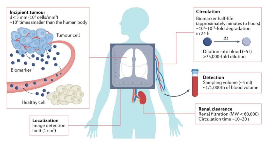 早期癌症检测对于持续脱落的生物标记物,如蛋白质,患者肿瘤的生物标记物并非普遍呈阳性,即使对于相同肿瘤类型的细胞,分泌率也可能变化多达四个数量级。此外,由死亡细胞释放的生物标记物只会脱落一次,它们的检测与健康组织的背景脱落很容易混淆。例如,细胞游离DNA(cfDNA)是从全身非癌细胞中释放出来的,这使得恶性细胞与正常细胞的体细胞突变比例或变异等位基因频率(VAF)在低肿瘤负荷下越来越难以检测。