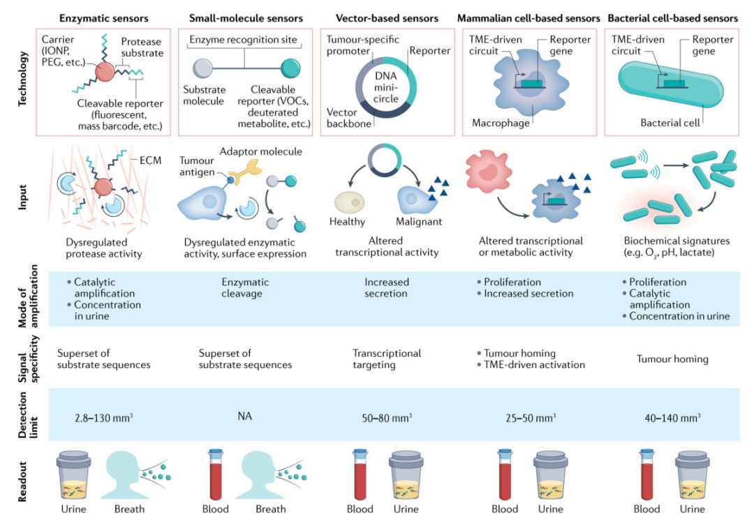 这些经验教训为基于生物工程传感器(如分子探针或基因编码载体)设计的新兴诊断提供了依据,这些传感器利用了早期肿瘤或其前体的失调特征,产生一个放大的信号,这些外源性传感器利用肿瘤依赖性激活机制,如酶放大,来驱动合成生物标记物的产生和放大。癌症也可以通过成像系统进行检测,这些系统可能具有合成生物标记物方法的基本特征,例如报告基因成像。这些新兴的技术推动了早期癌症检测的发展,合成生物标志物可能成为未来的早期癌症检测方法。