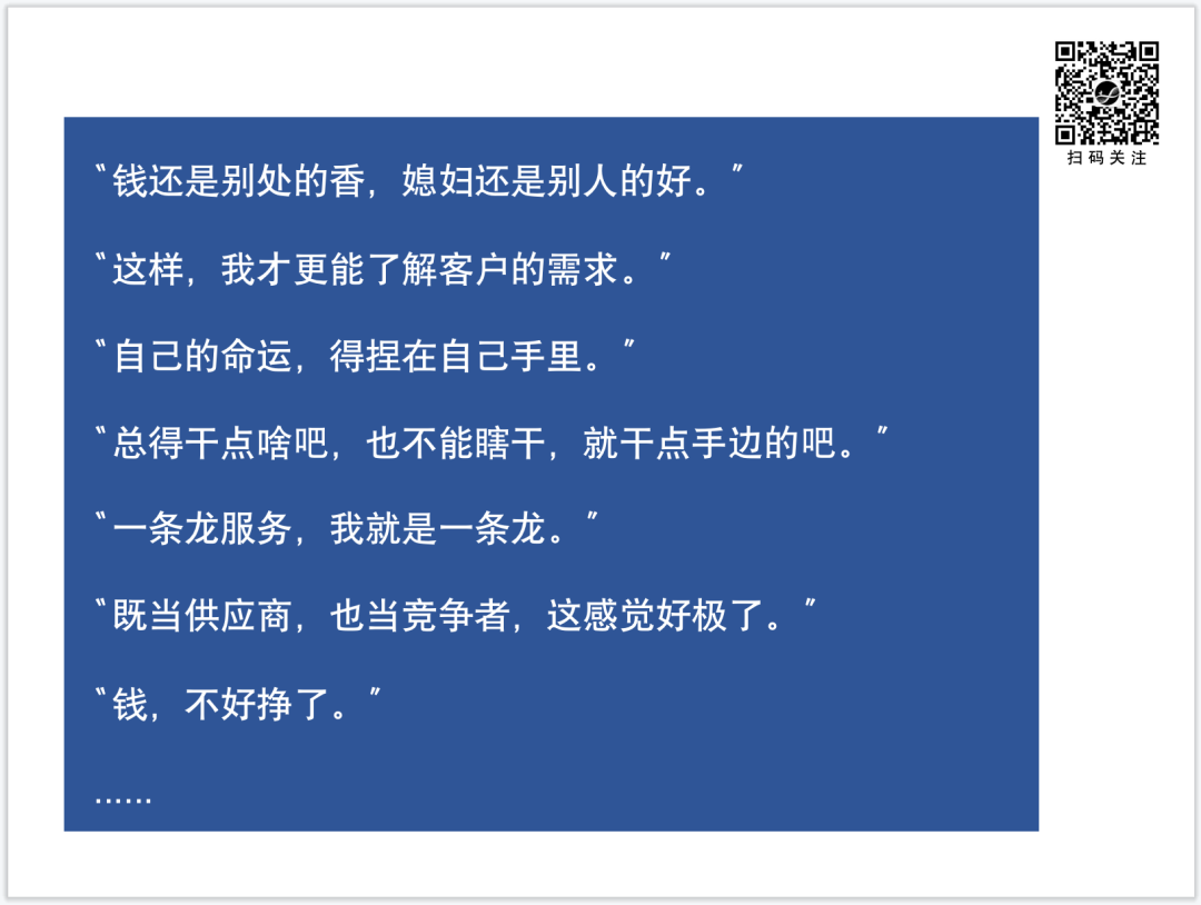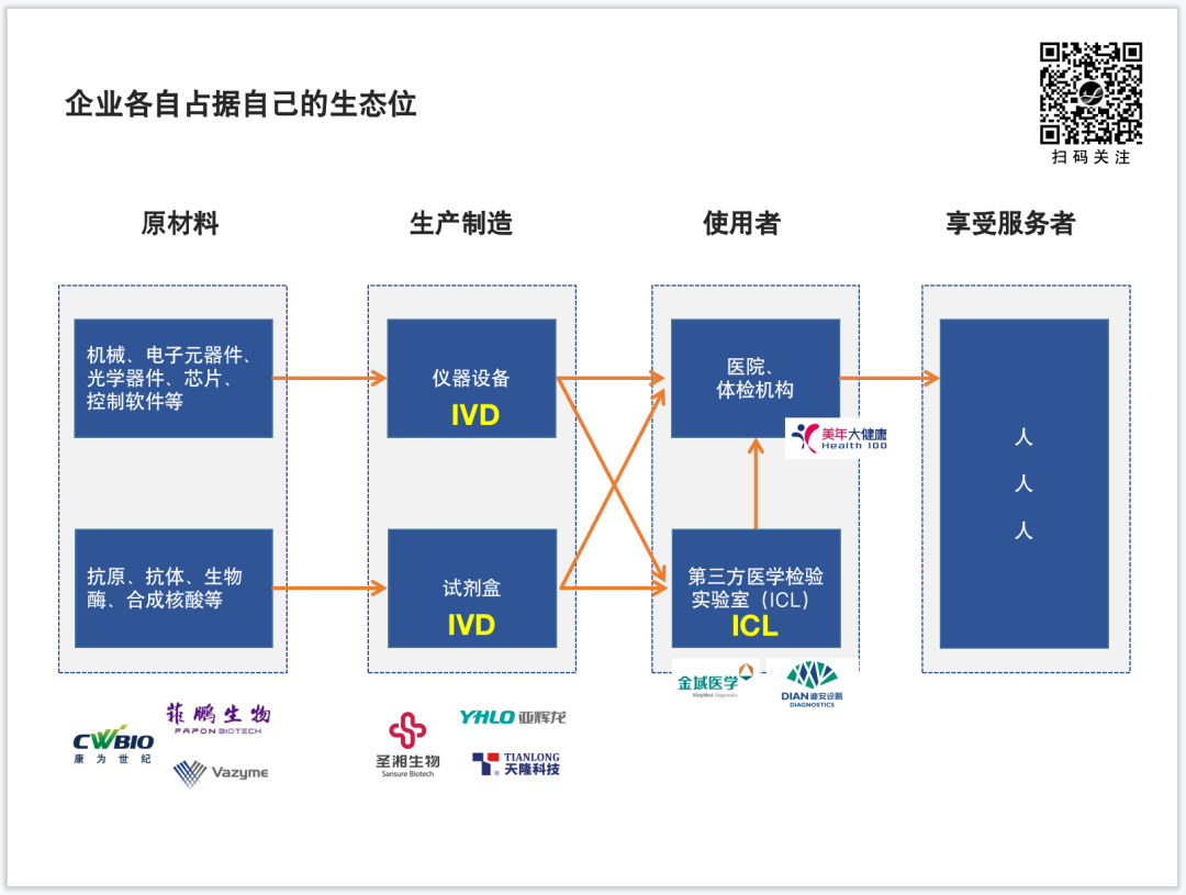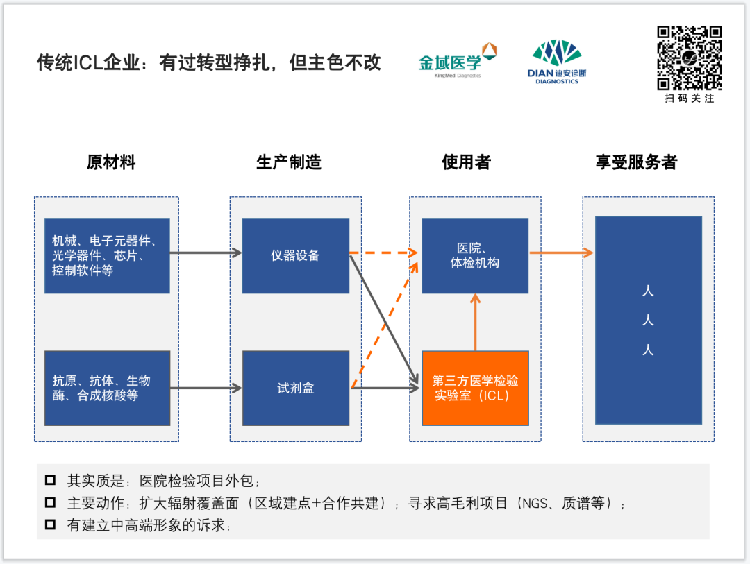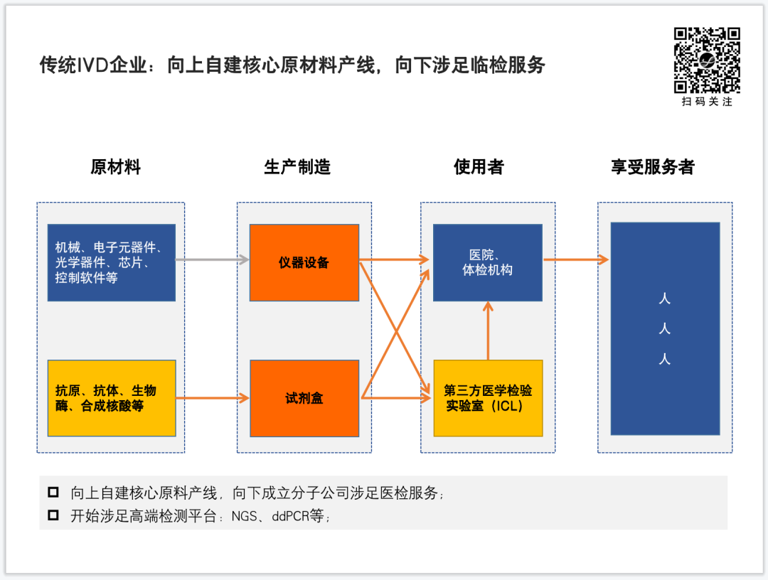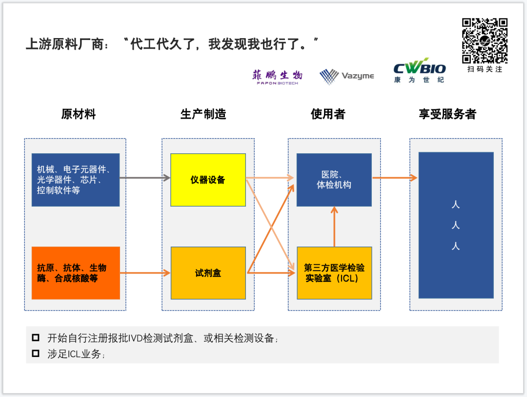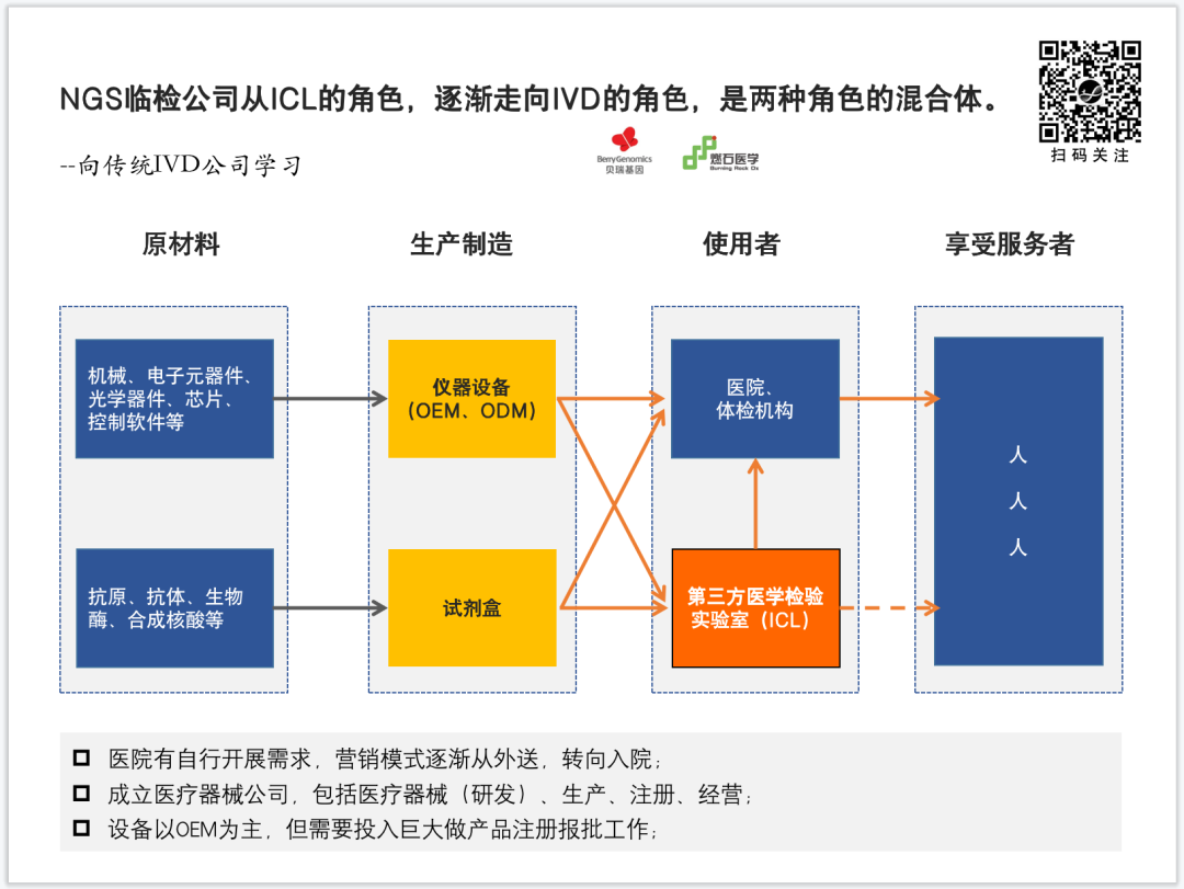 市面上这么多家公司,如何进行划分? 我们发现,越来越难以一个传统的标签去定义一家企业,产业链上不同占位的企业开始相互渗透。突然发现有一天,客户变成了竞争对手,竞争对手又变成了潜在客户。 当大家的边界变得模糊,谁会是你门口的野蛮人? 今天是周五胡侃时间,一套PPT,换个花样给大家讲讲“NGS、IVD、ICL、原料厂家的四向奔赴之路”,欢迎留言讨论。 (关注公众号,后台回复“野蛮人”获取) 01 “造测序仪”=“造公交车” 无论是行业研报,还是在各种推文中,我们都能看到“产业链上中下游”、“全产业链布局”的分析框架。但“上中下”的概念,是相对的;或大家并未在一个行业内去定义上中下游,这并非一个约定俗成的概念,容易造成混乱。举例: 基于原料公司的上中下游-诺唯赞 基于NGS公司的上中下游 基于ICL公司的上中下游 但如果我们定义一个特定的场景:临检市场。把相关的企业都列入一个体系(不再以传统的行业产业链定义),回归其最通俗的理解,可以如下面,以“一辆公交车”的例子作类比: 客车制造公司,采购轮胎、玻璃等原材料,生产制造汽车,卖给公交车公司,进而给乘客提供乘车服务。依次是原材料、生产制造、使用者、享受服务者。 类比医疗检测市场: IVD企业,采购硬件、试剂、耗材等原料,生产制造成设备成品、检测试剂盒,卖给实验室(医院+体检机构+第三方医学检测公司ICL),进而为受检者提供检测服务。 原本:在这一个传统的体系下,大家各司其职,各占其位,和和美美 👇 02 传统NGS企业: “当我想自己造/贴牌一辆公交车。” NGS临检公司,逐渐从ICL的角色,向上走向IVD的角色。 传统定义的NGS临检公司,其最初形态,是一家第三方医学检验实验室。和金域、迪安的功能类似,即医院的检验项目外包。 随着时间的推移,NGS公司开始向“生产制造者”,即IVD角色转型,开始IVD产品的注册报批,营销模式也由送检模式,逐渐转向入院检测模式。(为配合这种模式,各家公司都成立了相应的医疗器械生产、经营公司)。 但事实上,绝大多数NGS公司,并不具备自行研发测序仪和检测试剂盒的能力,所以产品多以OEM、ODM方式进行。 参考:📎 寒气之下,对基因测序赛道的一些思考 03 传统ICL企业: “向三高(高端项目、高端形象、上游)进发。” 传统ICL企业,也开始投资布局上游,进军IVD企业。 参看:📎 大白话 | 1+2+3+N,看懂第三方医学检验实验室ICL的行业价值 ICL服务模式仍然是主要营收来源,说明业务模式未发生重大变化 👇 体外孵育,不如放手飞行 👇 NGS公司的共建,谁偷师的谁?👇 04 传统IVD企业: “新冠挣的钱,总得想办法花出去。” “嗯,那就先吃了窝边草。” 传统IVD企业,向上自建核心原料产线,向下涉足ICL服务。 上建原料产线,下建检验所,入股测序仪制造,投资肿瘤早筛,圣湘生物忙得不亦乐乎 👇 05 传统原料企业: “代工代久了,我发现我也行了。” 传统原料企业,开始涉足IVD、ICL领域。 06 诺辉健康: “我不和你们玩了,我去开辟新战场。” 07 医院: “嗨,你们都散了吧,全都我自己来。” 医院借LDT政策,实则是兼并了一部分IVD厂家的角色。 “嗨,你们还是回来吧,一起搭把手。” 08 当大家都脱离了自己的生态位, 跑到了客户/供应商那里抢生意, 这一现象说明什么? 但友情提示,尽管大家在业务内容上逐渐重叠,在营销模式上逐渐靠近,但各家其基础底色仍然不同,这事实上也造就了他们在变革路上的天然阻力,和能够抵达的天花板。 举个栗子,尽管金域加大了NGS业务占比,但金域可能从来都不认为自己是一家NGS公司;反之亦然,NGS企业也从来不会把自己定义成一家传统的ICL企业。 灵魂拷问: NGS、IVD、ICL与原料厂家的四向奔赴, 谁才是最大野蛮人? |