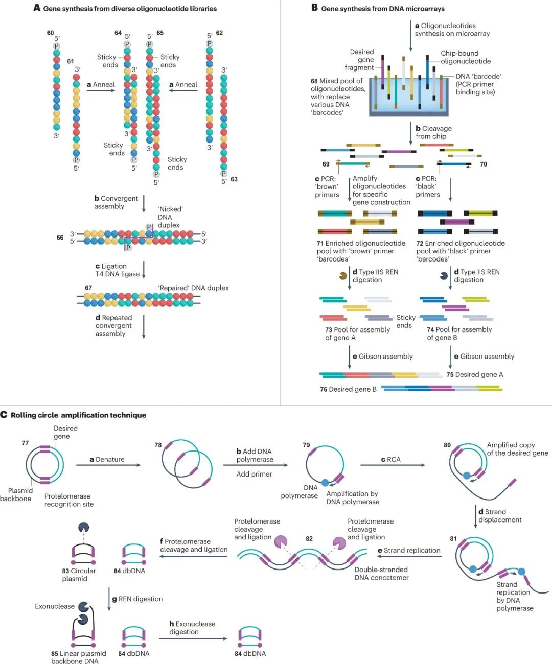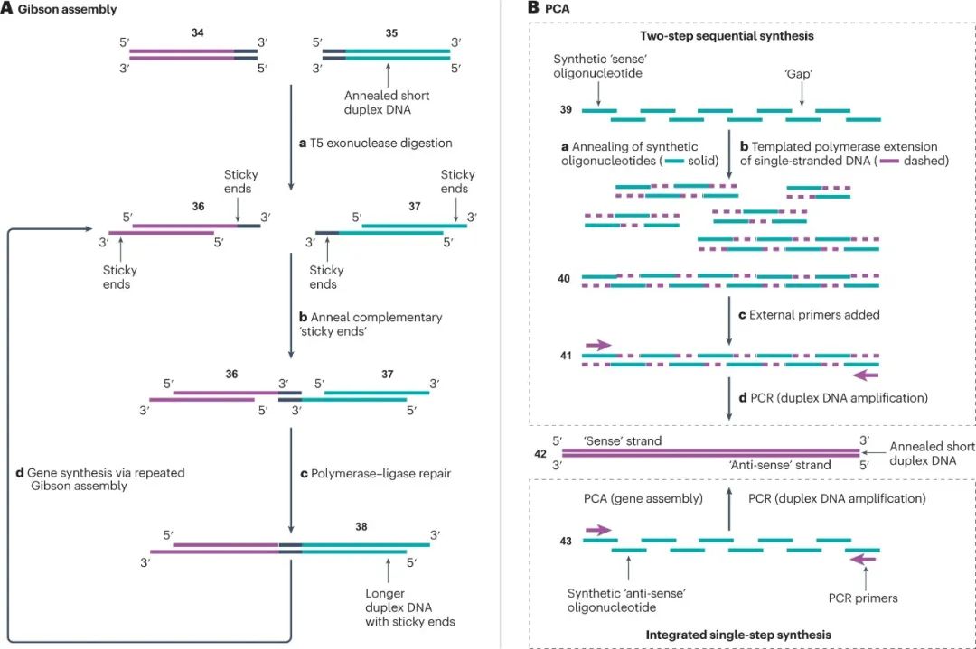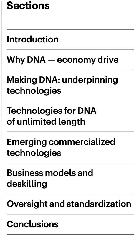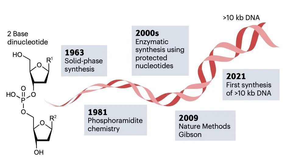 许多研究和商业活动部门对合成 DNA 的需求不断增加。如果能够大规模并低成本地提供 DNA,工程生物学、治疗、数据存储和纳米技术将能获得快速发展。受到下一代测序和基因编辑技术成功的刺激,DNA 合成已经成为一个新兴行业。然而,>200 bp 序列的合成仍然负担不起。为了克服这些限制并开始像读取 DNA 一样有效地编写 DNA,已经开发了替代技术,包括分子组装和克隆方法、模板非依赖性酶促合成、微阵列和滚环扩增技术。 DNA是生命的信息库。自发现以来,它已成为化学、生物学和材料科学的重要研究工具。在过去的二十年中,我们在从合成基因组生成包括活体微生物在内的生物系统方面取得了显着进步。这一成功的结果是,对 DNA 的需求不断增加,推动了新技术的发展,以提供更高纯度、更高数量和更低成本的 DNA。这些要求已将商业重点转向提供合成 DNA,而不是从天然来源分离 DNA。 逐个核苷酸顺序合成多核苷酸的能力允许控制 DNA 的组成和大小。合成 DNA 序列为研究人员提供了一种多功能工具来探测生命系统,而不是依赖于从生物体中分离出的自然序列。此外,对于某些应用,例如扩增无法访问的序列,合成 DNA 便成为唯一可行的选择。DNA 合成技术的发展也可能与材料科学和纳米技术相关,例如,在 DNA 折纸中,使用非天然核苷酸或非天然骨架(例如异种核酸xeno nucleic acids(XNAs))创建新型 DNA 结构和功能。 同样,同聚多核苷酸、共同嵌段和任意多核苷酸的合成不断发展,比如在单链 DNA 作为纳米级设备或基因组工程的支架或供体材料的应用中。 下一代测序 (NGS) 的创新改进了 DNA 的读取和编辑并彻底改变了细胞和群体基因组分析,这些分析现在已应用于“大型基因组”计划。DNA可以被大规模和低成本地进行分析。然而,缺乏大规模的 DNA 合成仍然是技术进步和基因组结构和细胞功能的大规模分析的障碍。这一障碍凸显了发达的读取 DNA、识别和测序基因组的能力与欠发达的编写 DNA 以及合成和产生无限长度和复杂性的 DNA 序列的能力之间存在的差距。 在当前 DNA 合成商业化的环境下,企业要么提供他们自己合成的 DNA,要么提供即用型自动合成仪器,供研究人员在自己的实验室中制造 DNA。这两种途径都使那些缺乏专业合成技能并因此缺乏 DNA 合成“低技能”的最终用户可以进行 DNA 合成。然而,通过去技能化广泛获取合成 DNA 可能会导至合成 DNA 的滥用,这就需要进行监管以减轻滥用造成的潜在危害。 在这里,我们回顾了现有的和新兴的 DNA 合成技术,重点是工业上开发的方法,作为加速长链合成 DNA 供应的一种手段。我们还讨论了 DNA 合成为商业化带来的挑战和机遇。 为什么选择 DNA——经济驱动力 工程生物学有望为全球资源可持续性挑战提供解决方案。工程生物学的进步已经通过建立有效的合作伙伴网络和投资于自动化来满足行业需求。事实上,全球经济中所有制造业投入的 60% 可以通过生物方式生产,而 30% 的研发支出用于与生物相关的行业。DNA 合成在这方面是不可或缺的,因为它提供了工程生物学的本质——具有所需组成、复杂度和长度的 DNA 分子。 DNA技术的四次浪潮 继 2000 年代初人类基因组测序(第一波 DNA 技术浪潮)之后,“读取 DNA”的能力以超摩尔定律的速度发展,该定律预测晶体管的数量每 2 年翻一番(图 1a)。随着该领域的成熟,第二波浪潮由 DNA 从头合成和 CRISPR 基因编辑等新技术推动,这赋予了“编辑和写入”DNA的能力。这使研究人员能够通过利用读取、编辑和写入 DNA 的能力来“应用 DNA”,用于疫苗、数据存储和药物输送设备等产品或基因组工程以生成具有有用特性的生物体,例如耐热植物。DNA 应用能力的提高带来了大规模合成的需求,以应对从健康安全到环境可持续性等行业挑战。例如,COVID-19 大流行表明,疫苗需求的增长会以多快的速度压倒现有的生产能力。随着 RNA 和 DNA 疫苗继续获得批准用于治疗主要疾病,包括 COVID-19,对大规模生产DNA 的需求正在增长。同样,合成 DNA 可用于能够适应气候变化、缓解粮食安全挑战的植物。活化的 DNA 修复提高了植物对热的耐受性,同时引入合成基因使作物能够在不同条件下更有效地收集养分和水分。因此,有效的 DNA 合成对于缩小 DNA 读写能力之间的差距至关重要。 图 1:DNA 合成的技术更新。 a,以每人每天的核苷酸数量估算的 DNA 读取和 DNA 写入(合成)生产力。灰色箭头表示当前读取 DNA 和写入 DNA 之间的生产力差距。椭圆形虚线突出显示了 DNA 合成行业实现大多数重要里程碑以缩小差距的时间范围。DNA 合成数据(红线)仅适用于基于柱子的合成仪器。图中显示了每个芯片的晶体管数量(摩尔定律)以供比较。该图使用文献中可用的数据。b,报告中讨论的DNA合成技术里程碑时间表。为简单起见,并未显示所有里程碑。NTP,核苷 5'-三磷酸;PCA,聚合酶循环组装;TdT,末端脱氧核苷酸转移酶;TiEOS,不依赖于模板的酶促寡核苷酸合成。 自从首次了解 DNA 的结构(方框1)以来,已经取得了实质性的里程碑,为新产业铺平了道路。四十多年来,人们采取了简短但细致的步骤来建立用于逐个核苷酸逐步合成 DNA 的基础化学(图 1b)。开发了化学方法以可靠地提供短的 <200 个核苷酸的 DNA 链,称为寡核苷酸。这些方法针对自动合成仪进行了优化,成为基因工程和测序不可或缺的工具。在此之后,已经实现了酶促和混合方法
