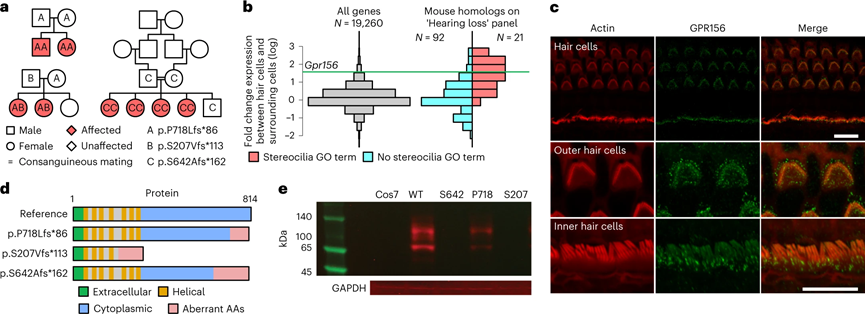 隐性遗传性先天性听力障碍是一种常见的遗传性疾病,其特征是患者从出生时就存在听力障碍,这可能会影响语言和认知的发展。这种听力障碍通常是由遗传因素引起的,可以是由单个基因突变引起的单基因遗传,也可以是由多个基因突变和环境因素共同作用引起的复杂遗传。BeviMed确定了GPR156中高影响变异与特定疾病先天性听力障碍之间的隐性遗传关联。两个高影响力突变体是导至这种关联的原因。其中一个突变体是1bp插入变异(p.S207Vfs113);另一个突变体也是1bp插入变异(p.P718Lfs86)。在第一个家族中,有两个患者,均为该变异的纯合子,由杂合父母遗传。在第二个家族中,也有两个患者,这种情况下是由母系遗传相同的p.S207Vfs113变异和父系遗传不同的p.P718Lfs86变异所致的复合杂合子。使用GeneMatcher31,我们在沙特阿拉伯发现了一个含有两个致病性突变的家系,这两个突变预测p.S642Afs*162,均为GPR156的截短变异。在这三个家族中的八名患者均表现为先天性的非综合征性双侧感音神经性听力损失。GPR156中的双等位基因链截短变体通过阻止GPR156蛋白的表达导至先天性听力损失,从而破坏听觉上皮细胞中的静纤毛形成。GPR156编码一种膜蛋白受体,这种受体在耳蜗和听神经中表达。如果GPR156发生功能丧失突变,就可能导至其编码的受体无法正常工作,从而影响耳蜗和听神经的正常发育和功能,最终导至隐性遗传性先天性听力障碍。 图3 GPR156中的功能缺失变异会导至隐性先天性听力损失(图源:[1])此项研究通过对罕见疾病的基因分析,开发了一种轻量级且易于部署的关系型数据库Rareservoir,并使用BeviMed等方法对罕见疾病进行了基因分析。在统一分析中,发现了260种关联,其中241种在几十年的基因研究中已经发表过。这些关联涉及到86种疾病类别,包括多个器官系统。此外,还发现了19种未知的关联,其中三种涉及到之前未涉及的人类疾病相关基因。这些研究结果提供了一种可能性,即随着队列规模的扩大,统计推断的结果可能有助于指导临床报告过程。艾卡恩医学院西奈山分校遗传和基因组科学副教授Ernest Turro博士说:“虽然罕见疾病的发生率很低,但总体而言,它们非常普遍。找到剩余的病因对于我们理解人类生物学以及开发诊断和治疗方法非常重要。许多患有罕见疾病的人们在多年的努力下才能获得遗传诊断。通过开发和应用统计方法和计算方法,寻找罕见疾病的新病因,我们希望扩大对这些疾病潜在病因的认识,缩短患者的诊断时间,并为治疗的开发铺平道路。”本研究有几个局限性。首先,大约82%的100KGP参与者是欧洲血统,限制了识别其他血统群体特有的致病变异的能力。;其次,在分析的260个病例集中,28个包含少于5个先证者,限制了确定相应疾病类别的原因的能力,并突出了继续招募极罕见疾病患者的必要性;再者,研究只考虑了编码基因中的SNV和插入缺失。对非编码基因和基因组调控元件的结构变异和罕见变异的探索可能有助于进一步确定病因;此外,研究将注意力集中在罕见疾病的单基因模型上,但是某些罕见疾病的遗传病因可能是多基因的;最后,单基因疾病临床表现的重要变化可以用多基因效应来解释。这些局限性指向未来研究的多个有希望的途径,以揭示罕见疾病的剩余未知遗传决定因素。[1]Greene D; Genomics England Research Consortium, Pirri D, Frudd K, et al. Genetic association analysis of 77,539 genomes reveals rare disease etiologies. Nat Med. 2023 Mar 16. doi: 10.1038/s41591-023-02211-z. Epub ahead of print. PMID: 36928819.