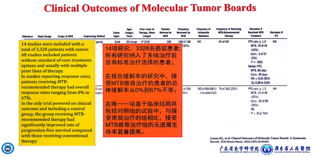 既往研究报道显示:MTB是可以改善癌症患者的临床生存结局。5 该系统评价共纳入14项研究,累计3,328名癌症患者,所有研究均包括没有标准护理选择且通常接受过多种先前治疗的患者。在报告反应率的研究中,接受MTB推荐治疗的患者总体反应率为0%~67%。并且在唯一一项以临床生存结局为依据并包括对照组的试验中,接受MTB推荐治疗组与接受常规治疗组相比,无进展生存期(PFS)显著提高。
