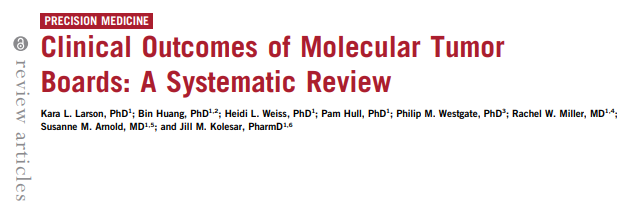 5.Larson KL, Huang B, Weiss HL, Hull P, Westgate PM, Miller RW, Arnold SM, Kolesar JM. Clinical Outcomes of Molecular Tumor Boards: A Systematic Review. JCO Precis Oncol. 2021 Jul 9;5:PO.20.00495.