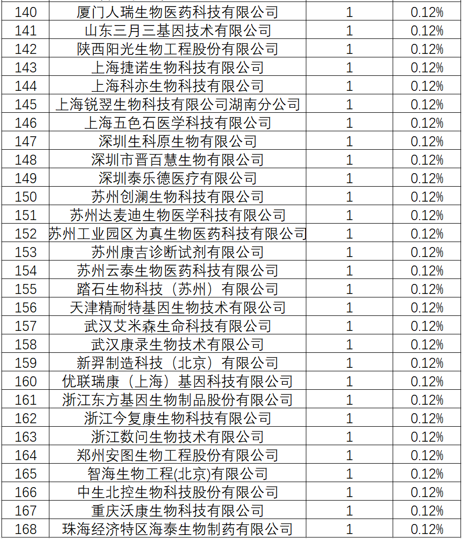 这些公司主要集中在经济发达省份,其中,广东、北京、上海、江苏、福建是获批产品排前五名的省份,占总PCR试剂盒的73.3%,具体数据看图7。 图7 PCR试剂盒省份分布